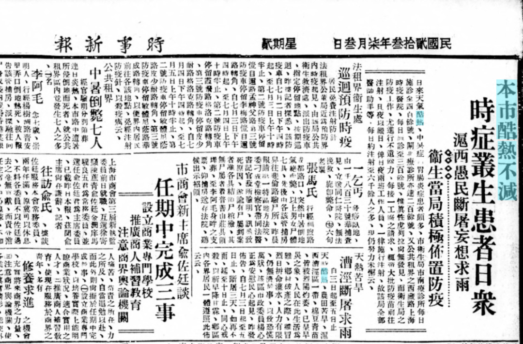 6月25日,《申报》记载:据西藏路上海时疫医院统计,自晨至晚,因时疫投院者162名,内有4名不及救治而死,中暑6名,痢疾8名。