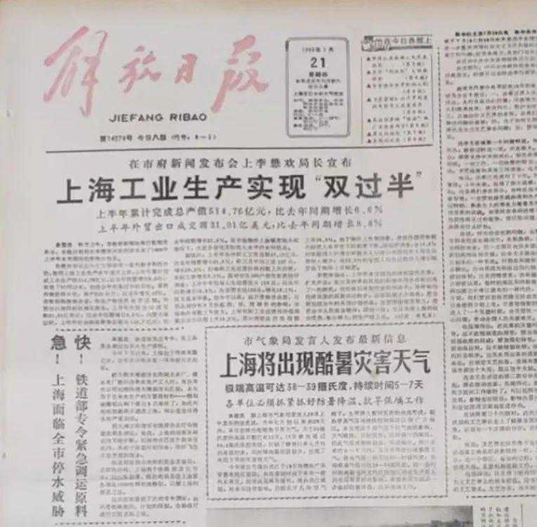 《》1988年7月21日头版刊发“上海将出现酷暑灾害天气”报道