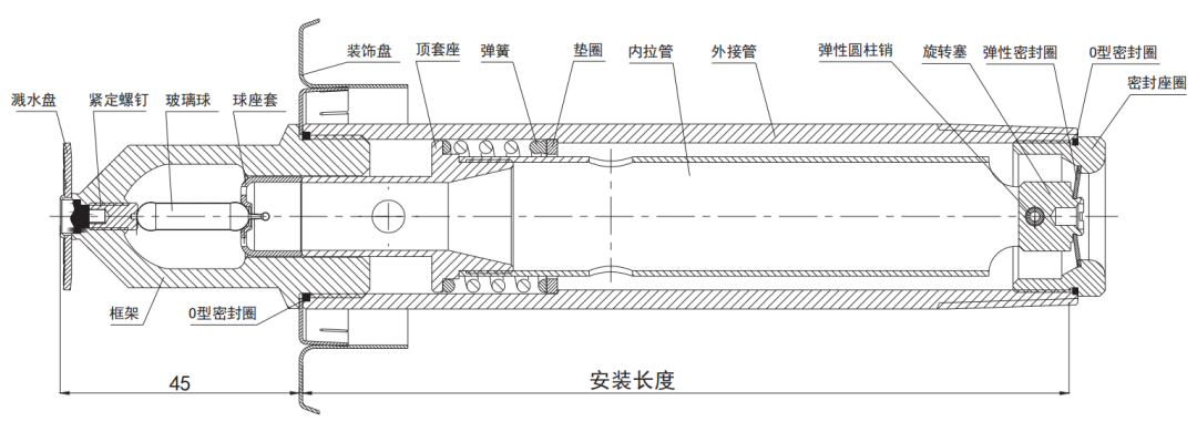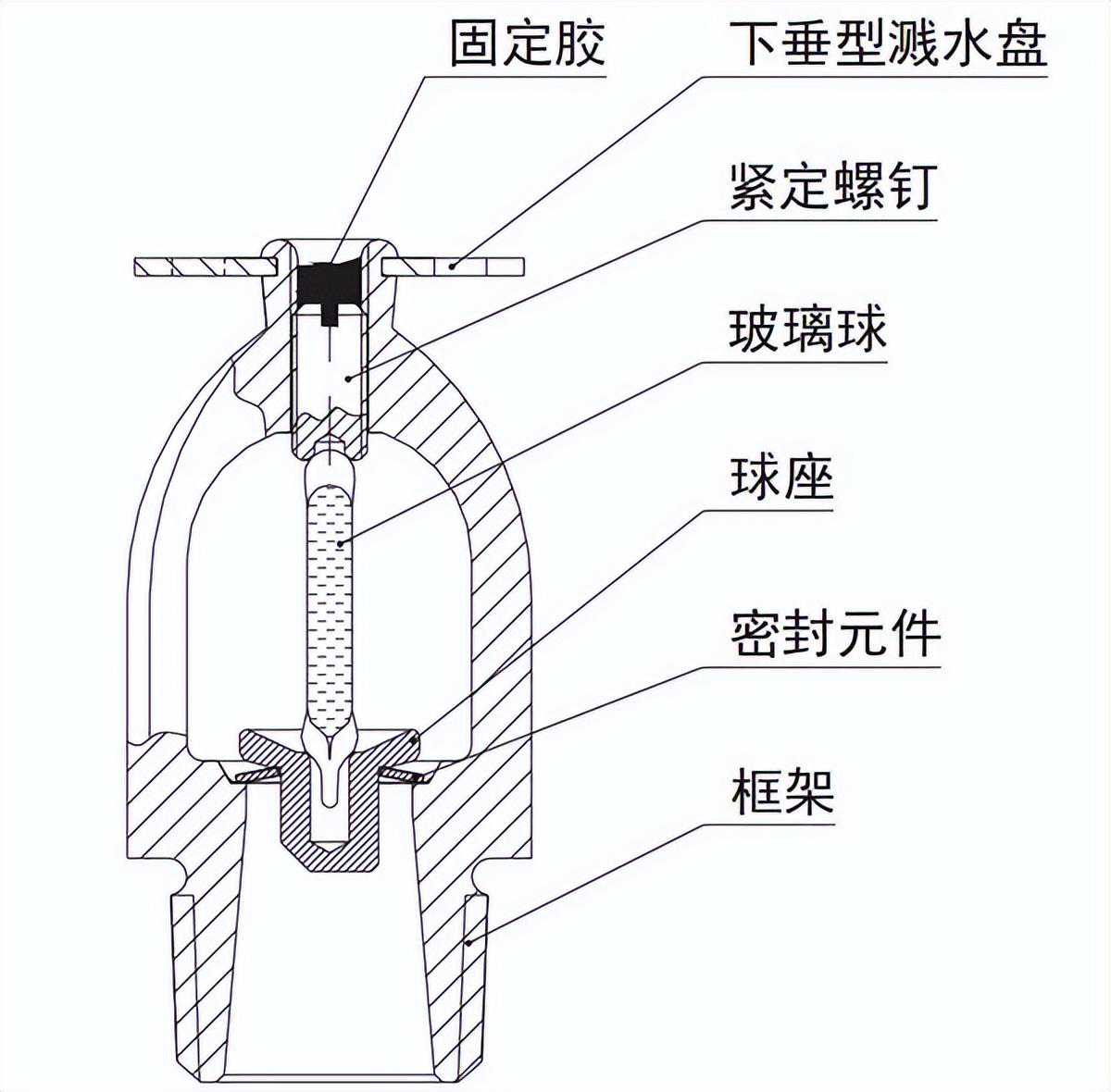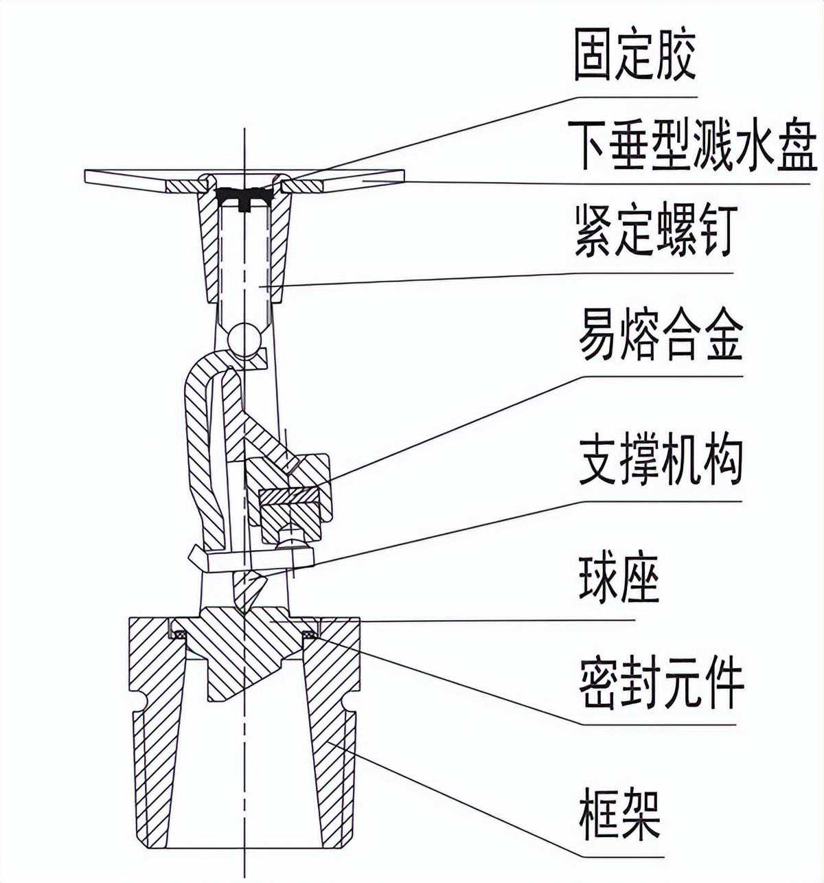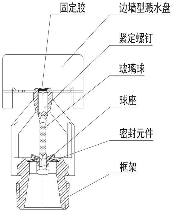 洒水喷头由框架、动作元件、密封元件、球座、紧定螺钉和溅水盘、固定胶等组成。