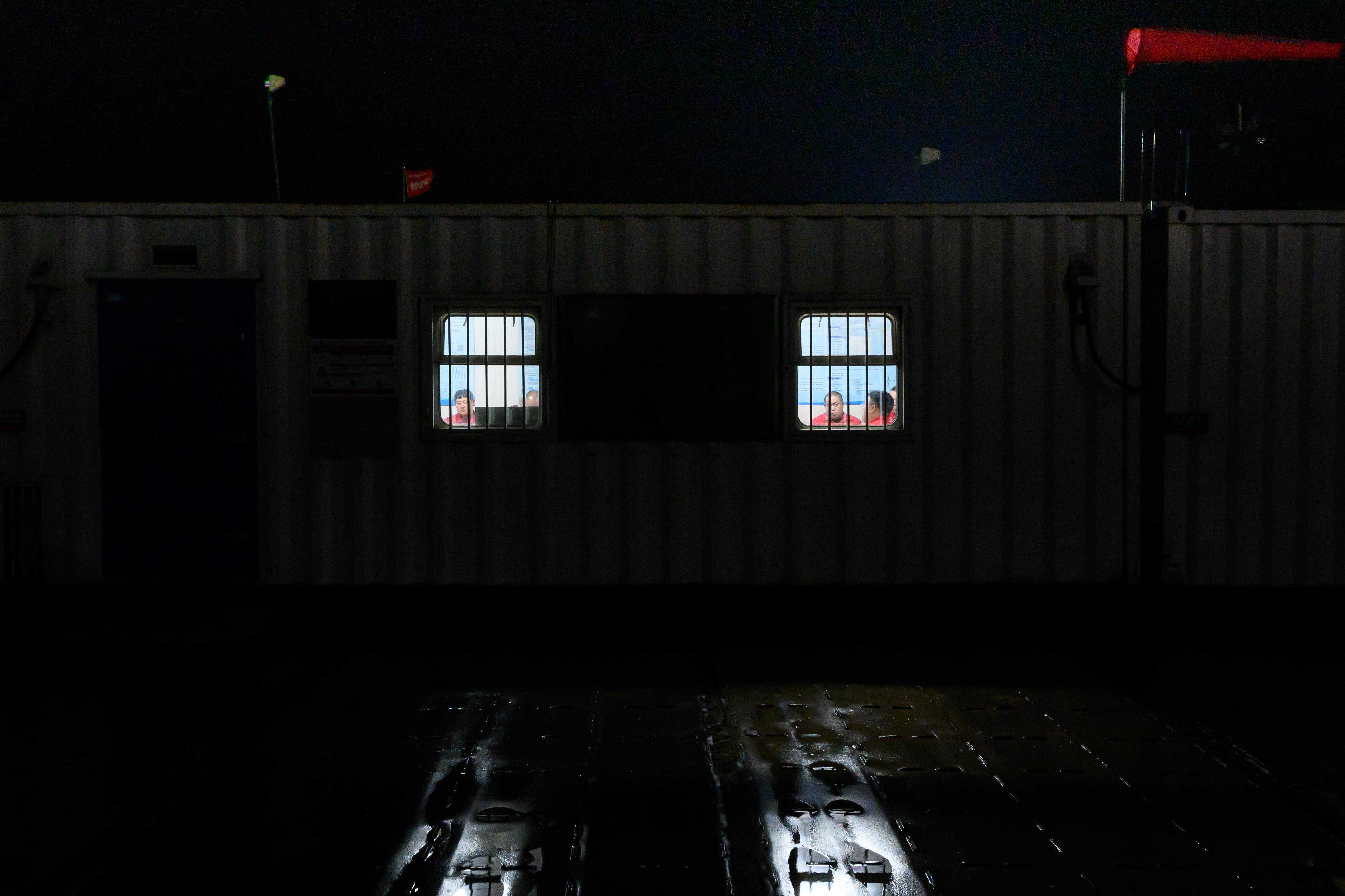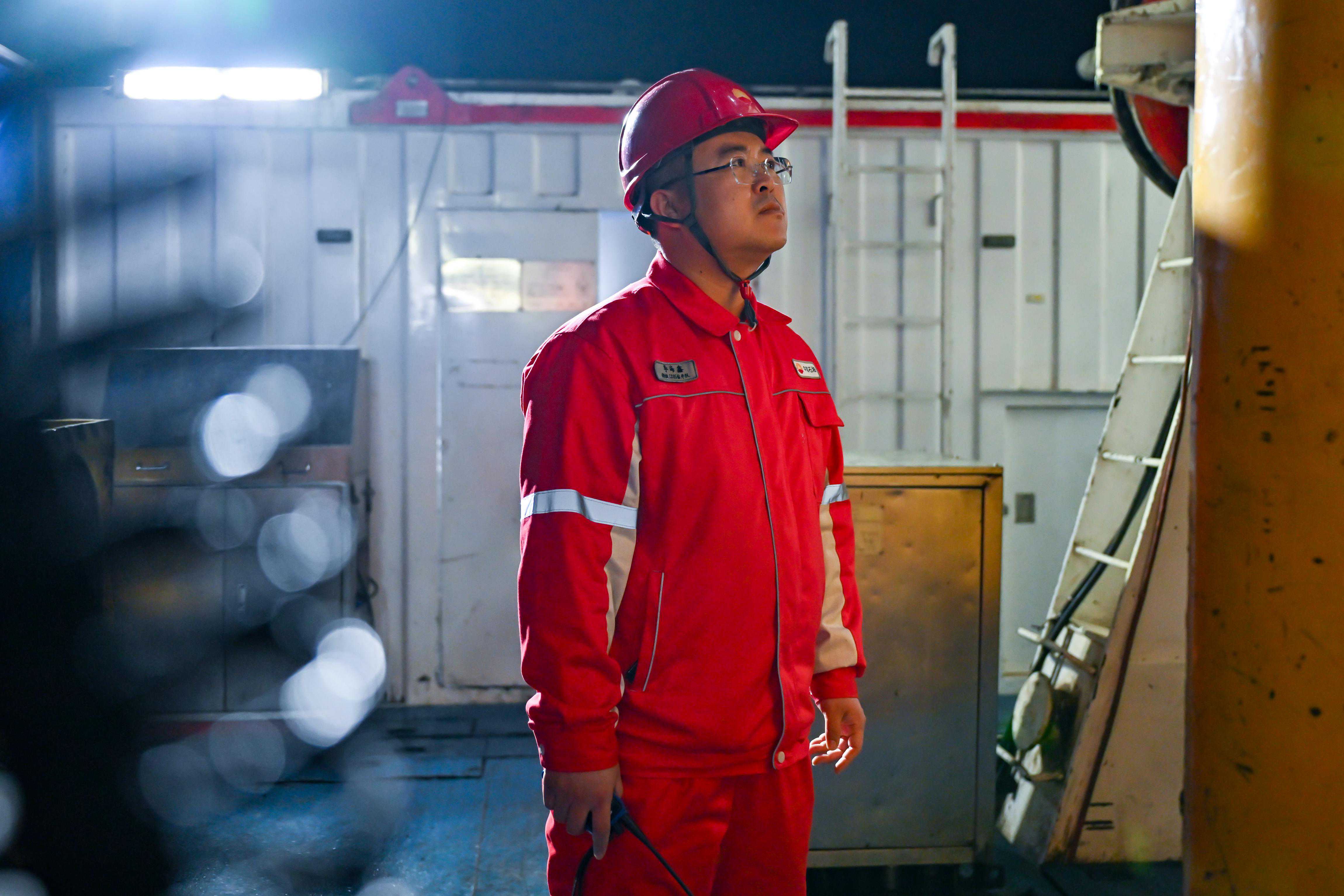 3月27日,1205钻井队副队长李海鑫在夜间巡检钻井设备。新华社记者张铖摄