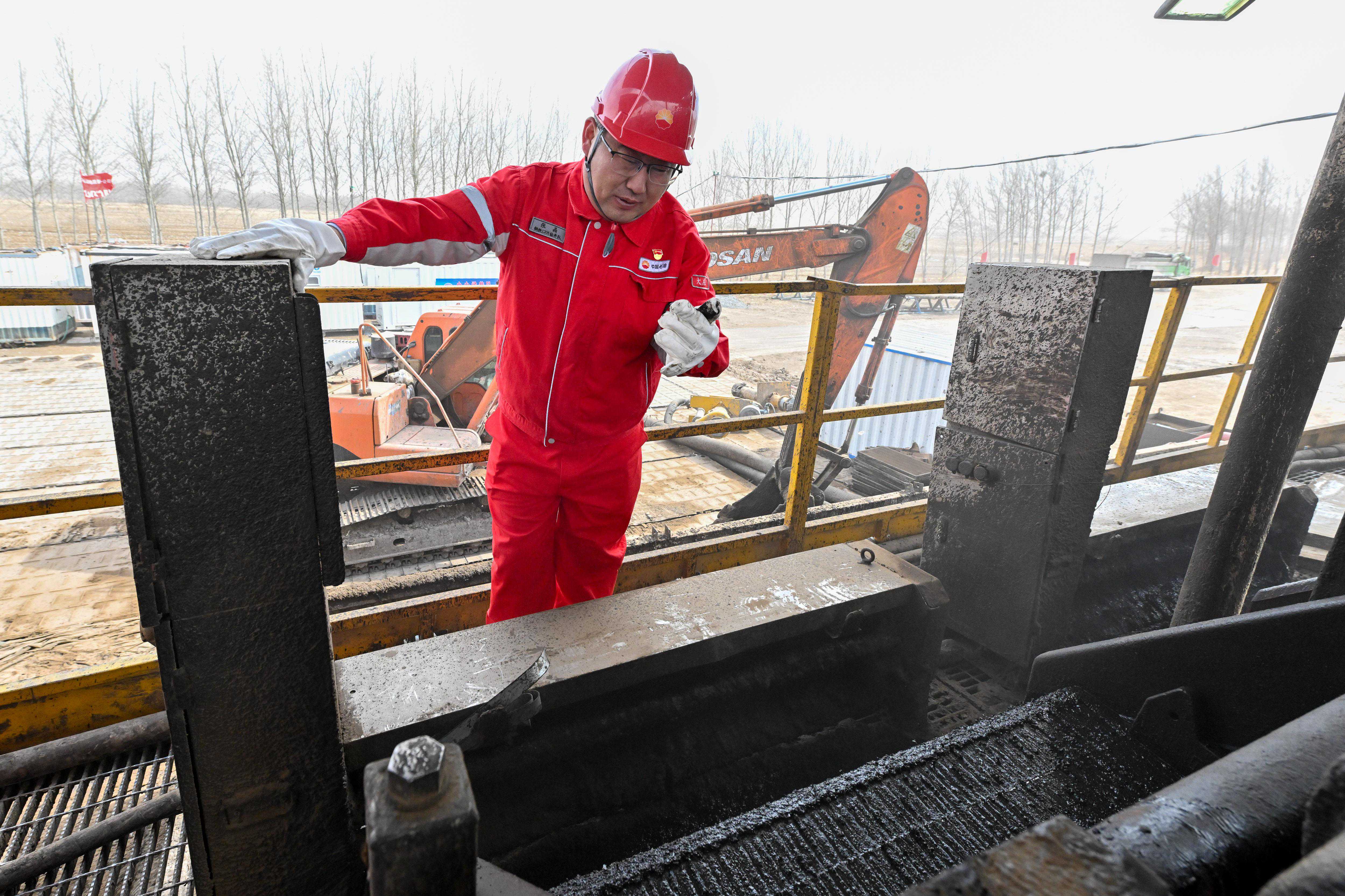3月27日,1205钻进队泥浆工张彪(右)、梁涛在罐区进行交接班巡检。新华社记者陈益宸摄