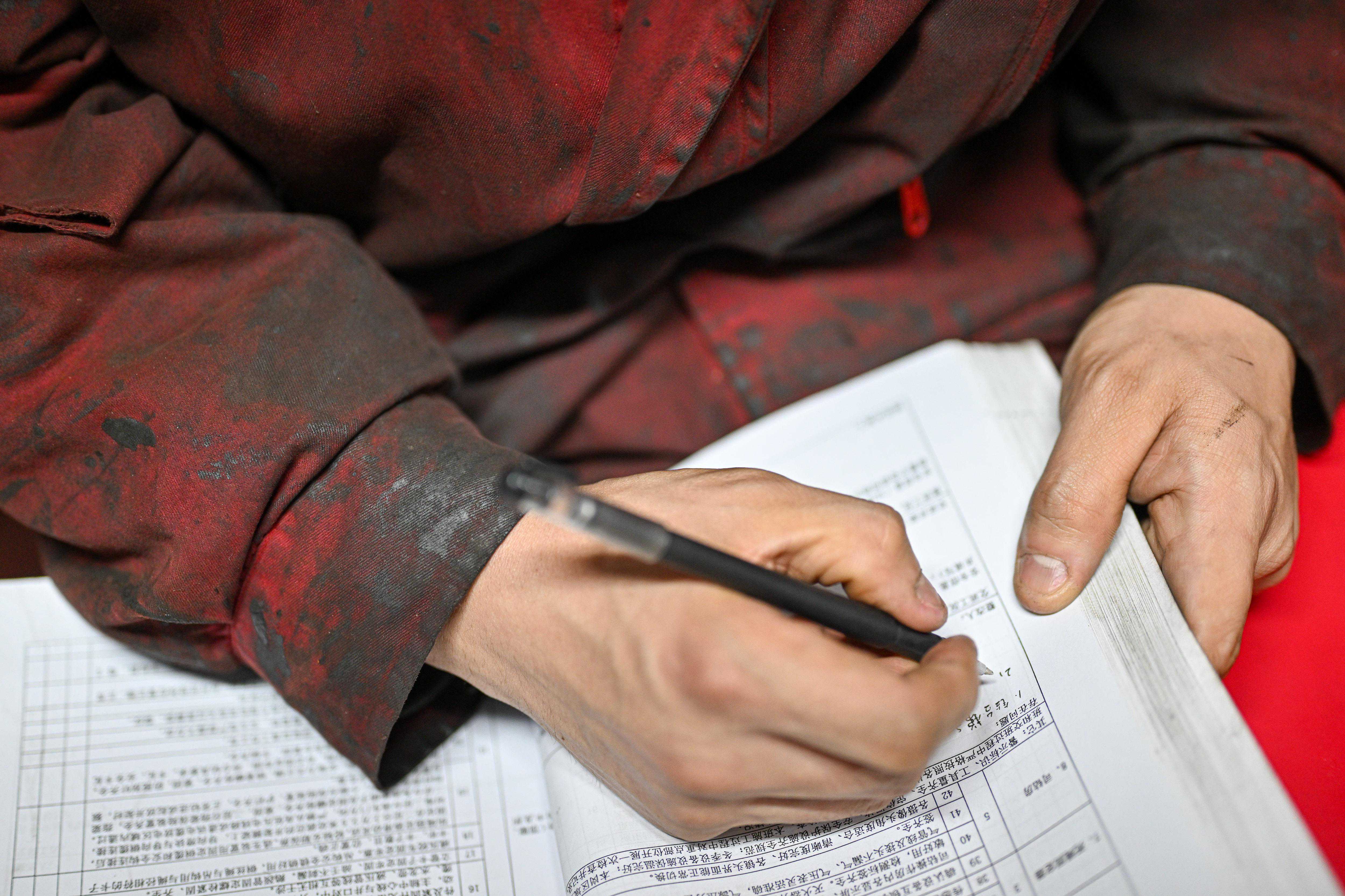 3月27日,1205钻井队井架工陈琦在交接班会议上填写日志。新华社记者陈益宸摄