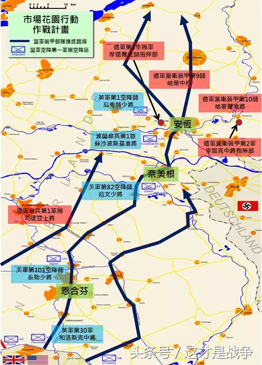 图二:市场花园作战计划图与战前双方兵力部属