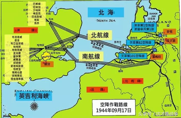 1944年9月17日10时00分,「市场花园作战」开始,由英国第1空降师、美国第82及第101空降师分别在1,000架C-47运输机及2,500架滑翔机载运与1,500架战斗机的掩护下,从英国本土24个基地,分由南北两航路,向荷境安恒、奈美根、恩和芬附近实施两梯次的空降突击作战。