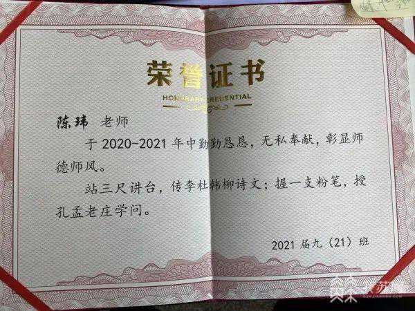 每个“荣誉证书”都是量身定制的,有不同的“颁奖词”。比如该班语文老师陈玮的证书用词就比较文艺:“站三尺讲台,传李杜韩柳诗文;握一支粉笔,授孔孟老庄学问。”