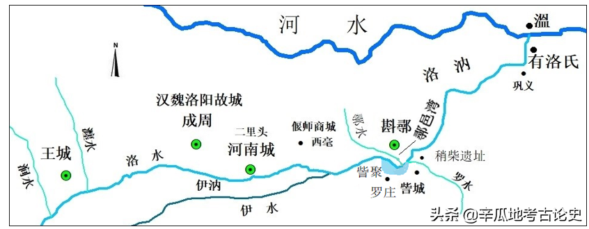 《逸周书·度邑》周武王说:“自洛汭延于伊汭,居阳无固,其有夏之居。”夏都斟鄩在洛汭,洛水与黄河交汇地带。居阳指都城在洛水之阳。以此推之,斟鄩城在洛水之北,訾城西北,在今偃师市山化镇区域。