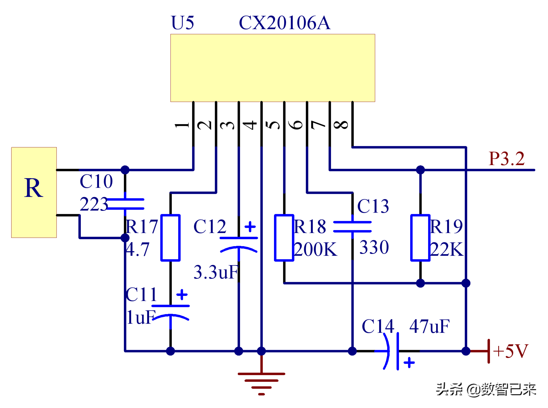 由于超声波在空气中传播,其能量会随传输距离的增大而减小,从远距离障碍物反射的回波信号一般比较弱,所以在设计超声波接收电路时,要有较大的放大倍数;为减小环境噪声对回波信号的影响,也要考虑选用滤波特性较好的电路,使回波易于检测。超声波接收电路使用集成电路CX20106A,可用来完成信号的放大、限幅、带通滤波、峰值检波和波形整形等功能,如图3所示。