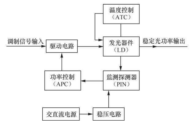 影响半导体激光器(LD)输出光功率不稳定的因素很多,如阈值电流、功率效率随温度和时间的变化等。因此,应为LD的工作环境温度进行恒温控制,即采用自动温度控制(ATC),同时对LD的输出光功率也应进行稳定控制,即采用自动功率控制,具体电路如图2所示。