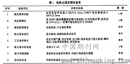 电除尘的专业管理机构应当是安全环保科,科内设专职或兼职环保员。其主要职责是:(1)对电除尘设备的运行进行监控,掌握除尘设备完好率、同步运行率、除尘效率、岗位粉尘合格率、矽肺发病率五大指标。(2)定期对电除尘操作工进行岗位培训和技术培训,使其逐步掌握电除尘器的运行维护技术及一般的环境保护知识,对电除尘器运行中出现的故障能够及时作出判断并进行简单处理。(3)负责电除尘器大、中修计划编排。(4)提出电除尘器的技术改造计划,不断推动技术进步。电除尘器属于技术含量较高的设备,如果只靠环保科管理,则无法协调各维修部门的关系,造成维护保养跟不上,使设备带病运行。因此在维护保养方面,应将电除尘设备与生产设备同等对待,由机动科统畴考虑电除尘器的维修问题,统一下达检修计划。其检修内容应当由环保员和设备管理人员共同确定,并对电除尘器定期进行联合检查.其检查内容见表l。