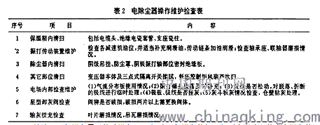 电除尘岗位工是一支专业水平要求较高的队伍,负有操作、检查、维护电除尘设备的重大责任,必须懂得电除尘器的工作原理,了解各部位的功能,并能通过各计量仪表所示数据判断电场运行状态,随时对有关量值、参.数进行调整,使电场处于最佳工作状态。为此,岗位工必须认真学习和掌握技术操作规程、设备检查维护规程和安全技术规程,作好交接班记录及设备运行记录.运行记录内容主要包括:硅整流变压器的一次电流、电压,二次电流、电压;抽风机运行电流、电压;阴、阳极振打周期;除尘器进出口温度及压力.以上各项每小时记录一次.另外,还需记录各电场开停时间、放灰时间、放灰量。有条件的还可以安装设备运行监控仪,通过PC机定时监测设备运行状况,并存储因、部位,并对电场可能发生故障的部位密切记录。注意,遇有停机机会,再进行电场检查求证,通过完整、连续的运行记录可以对电场以便尽快修复。电除尘器停机后,岗位工人的运行状况进行分析,了解电场发生故障的原主要检查维护内容如表2所示。