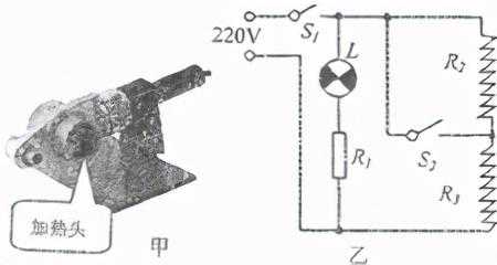 3.如图甲是用来焊接PVC塑料自来水管的热熔器示意图.通电后,加热头发热,使塑料水管的接头处熔化,然后将它们对接、紧压在一起,冷却后,水管就焊接好了.其内部电路图如乙图所示,S2为温控开关,S1是手动开关,L为指示灯,R1是限流电阻,R2和R3均为加热电阻.右表是它的部分参数.(1)保温状态下,开关S1和S2开关状态如何?并说明理由.(2)求出加热电阻R2的阻值;(3)若熔化lkgPVC塑料需要吸收l06J热量,某次焊接时需要熔化8OgPVC塑料,则正常情况下至少要加热多长时间?