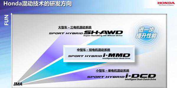 本田的混合动力系统SPORTHYBRID分为三种:包括用于小型车的单电机i-DCD(智能双离合驱动)系统、用于中端车型的双电机i-MMD(智能化多模式驱动)系统以及高级别的三电机SPORTHYBRIDSH-AWD系统。