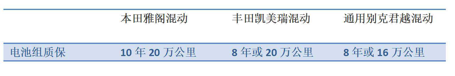 另外,电池组作为混动系统的储能部件,是可靠性的关键组件之一。丰田采用的是相对传统保守的镍氢电池,本田用的是技术比较先进的锂电池,理论上锂电池寿命超过15年。但是由于本田锂电池车型推广时间不长,不像丰田已经经历了数十年的检验,所以本田的i-MMD还有待市场检验。虽然如此,我们还是可以通过厂家的质保政策来窥探一些厂家的信心。本田的质保政策对比丰田和别克,无论是公里还是年限都是最有诚意的。