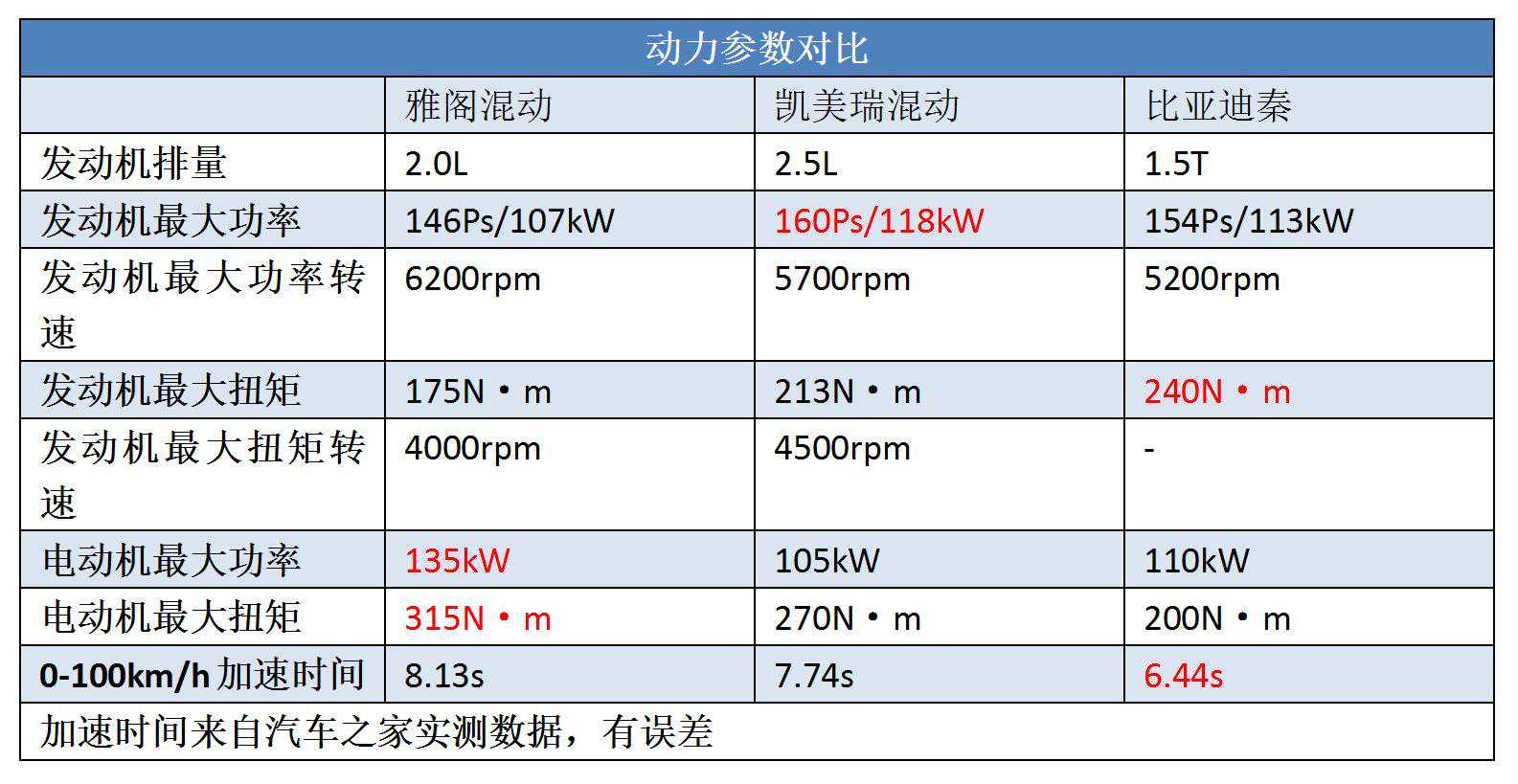 中型车作为汽车重要的主战场,刚好本田雅阁、丰田凯美瑞都搭载了各家的混动系统。从动力系统的账面数据对比上可以看出,本田和丰田走的技术路线是不同的,本田的电动机功率远大于发动机,而丰田则相反。本田把电机作为核心动力输出,发动机更多是个“充电宝”,丰田则走的是传统的混动路子,发动机依旧是主力,电动机更多在低速驱动时工作。说到混合动力车的动力加速,人们多会想起“纽北跑不过秦”这句话,疆哥也让具有一定江湖地位的插电式混合动力车比亚迪秦加入到动力的部分对比中。