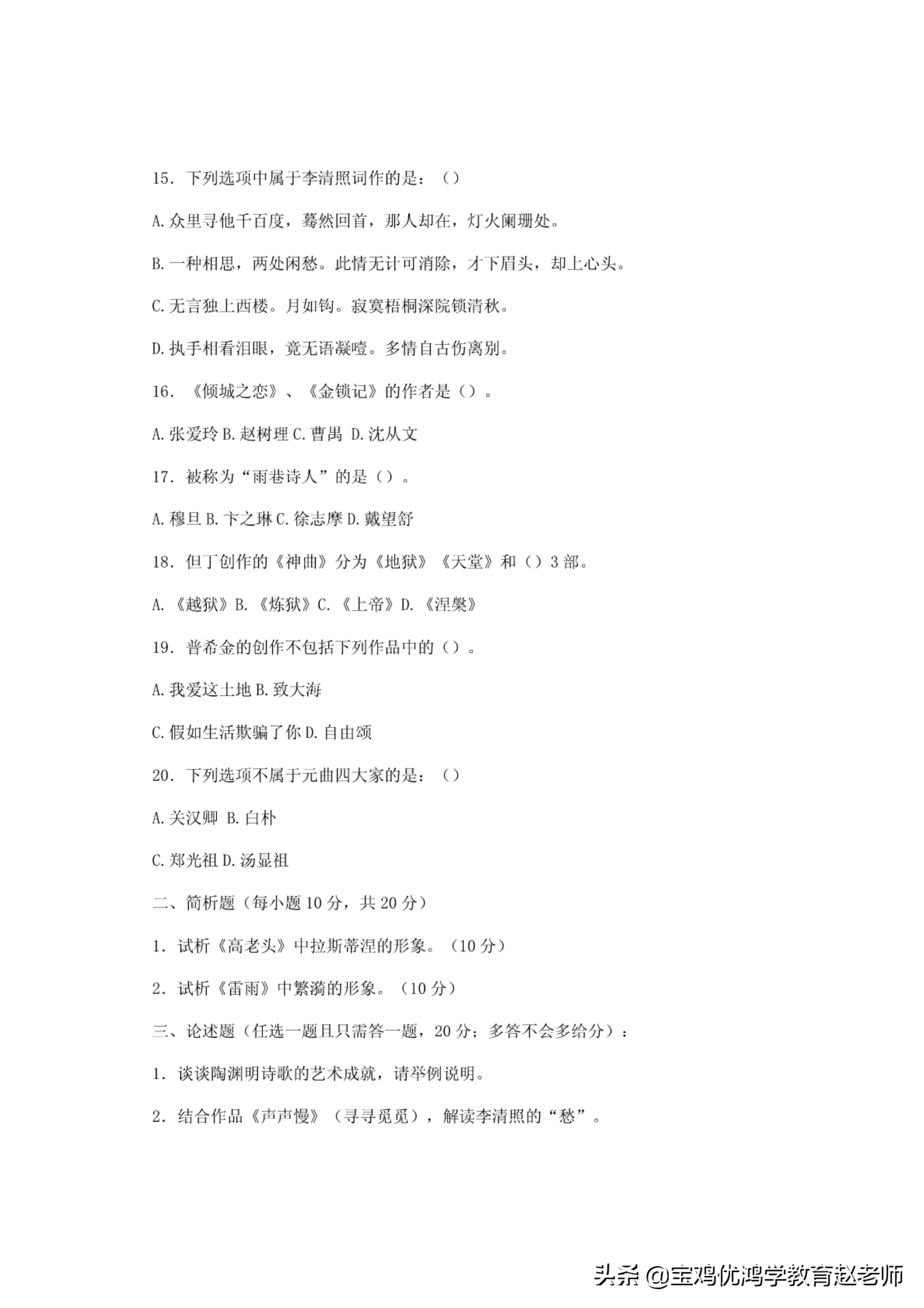 A.张爱玲B.赵树理C.曹陆D.沈从文17.被称为"阳巷诗人"的是()0A.穆旦B.下之琳c.徐志摩D.戴辛巨舒18.但「创作的《神由》分为《地狱》《夭堂》矛11()3部.