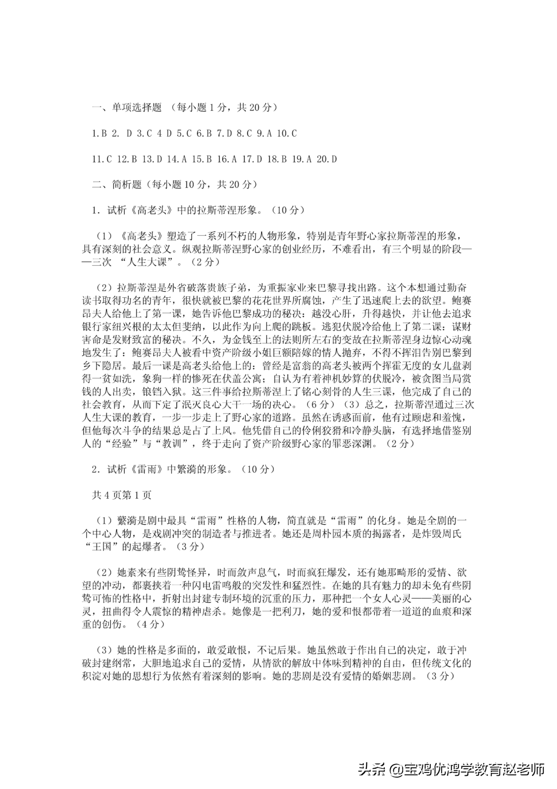 1.试析’《高老头》中的拉斯蒂涅形象口(10分)(1)《高老头》塑造了一系列不朽的人物形象,特别是青年野心家拉斯蒂汩的形象,具有深刻的社会意义.纵观拉斯蒂沮野心家的创业经历,不难看出,有三个明显的阶段一一三次"人生大课,,.(2分)(2)拉斯蒂涅是外省,做落贵族-{弟,为重振家业来巴黎寻找出路.这个本想通过勤奋读书取得功名的青年,很快就被巴黎的花花世界所腐蚀,产生了迅边爬上去的欲望.鲍赛日夫人给他上了第一课,她告诉他巳黎成功的秘诀:越没心肝,升得越快,jf让他去追求银行家组兴根的太太但斐纳,以此作为向上爬的跳板.逃犯伏脱冷给他上了第二课:谋财存命是发财致富的秘决.不久,为金钱主土的法则所左右的变故在拉斯蒂涅身边惊心动魂地发生了:鲍赛日犬人被看中资产阶级小知JR额陪嫁的情人抛弃,不得不挥泪特别巴黎到乡下隐用.段后一课是高老头给他上的:曾经是富翁的高老头被两个摆在无度的女儿盘剥得一贫如洗,象狗一样的惨死在伏盖公寓:自认为有着神机妙算的伏脱冷,被贪图去!用赏钱的人出卖,f良铛入狱.这三件事给拉斯蒂迦t了铭心刻骨的人生三课,他元成了自己的社会教育,从而下在f泯灭良心大干一场的决心.(6分)(3)总之,拉斯蒂涅通过三次入绝木课的教育,一步一步忐上了野心家的道路.虽然在诱惑面前,他有过顾虑和l羞愧,但他每次斗争的结果总是占了上风.他凭借自己的伶俐狡猾和冷静头脯,有选择地借鉴别人的"经验"与"教训",终于走向了资产阶级野心家的罪恶深渊.(2分〉2.试析《雷雨》I11繁浙的形象.(10分)