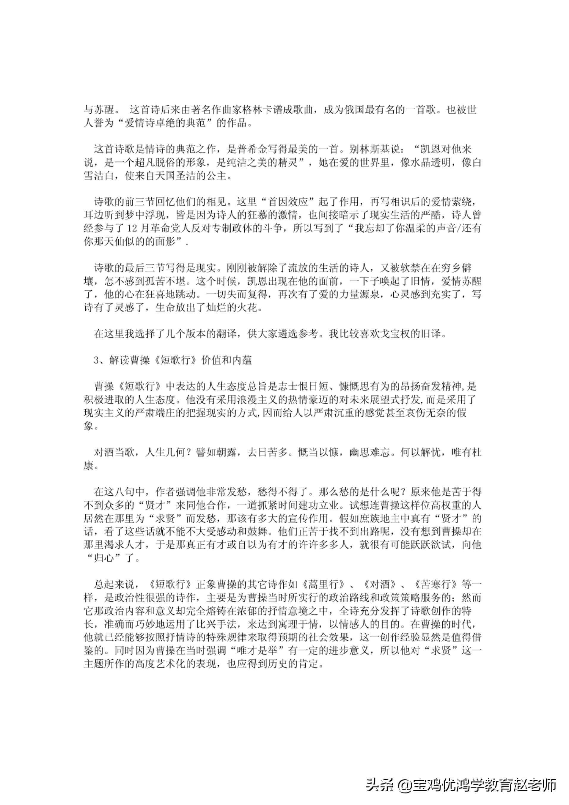 总起来说,《短歌行》if象曹操的其它诗作如《寓里行》、《对酒》、《苦寒行》等一样,是政治性很强的诗作,主要是为曹操当时所实行的政治路线和政策策略服务的:然而它那政治内容和意义却完全熔铸在浓郁的抒情意境之中,全诗充分发挥了诗歌创作的特伏,准确丽巧妙地运用了比兴于法,?|毛达到离亚|于惰,以情感人的H的.在曹操的时代,他就己经能够按照抒情诗的特殊规律来取得预期的社会效果,这创作经验显然是值得仙鉴的.同时|大的四操在气时强调"唯才是举"行一定的进步意义,所以他对"求贤"这一主题所作的高度艺术化的表现,也应得到历史的肯定.