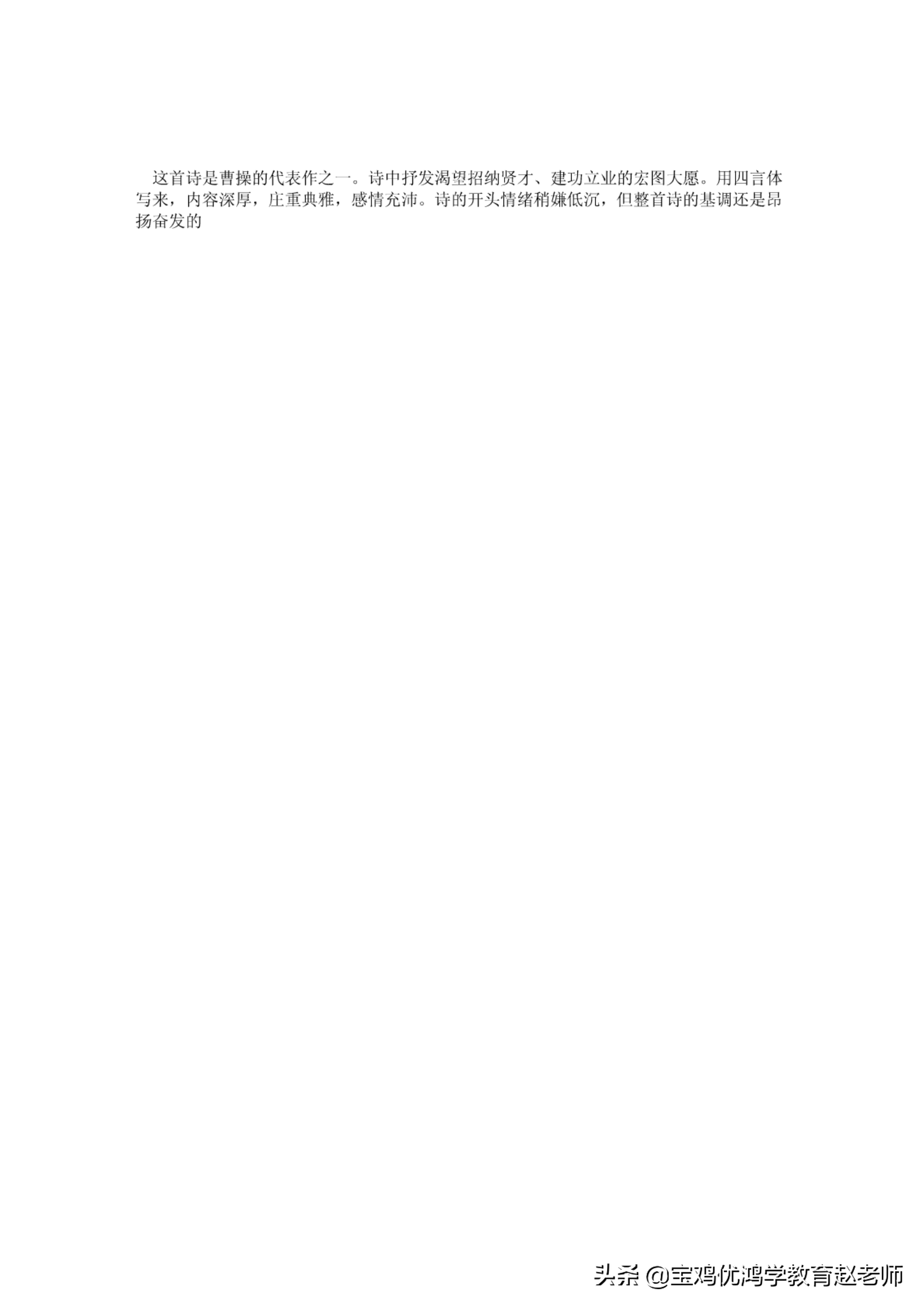 这首诗足曹操的代表作之一.诗巾抒发渴望招纳贤才、建功立业的宏降I)之愿.用四言体与来,内容深厚,庄军典雅,感情充沛.诗的开头情绪稍嫌低沉,但将首诗的基调还是昂扬奋发的