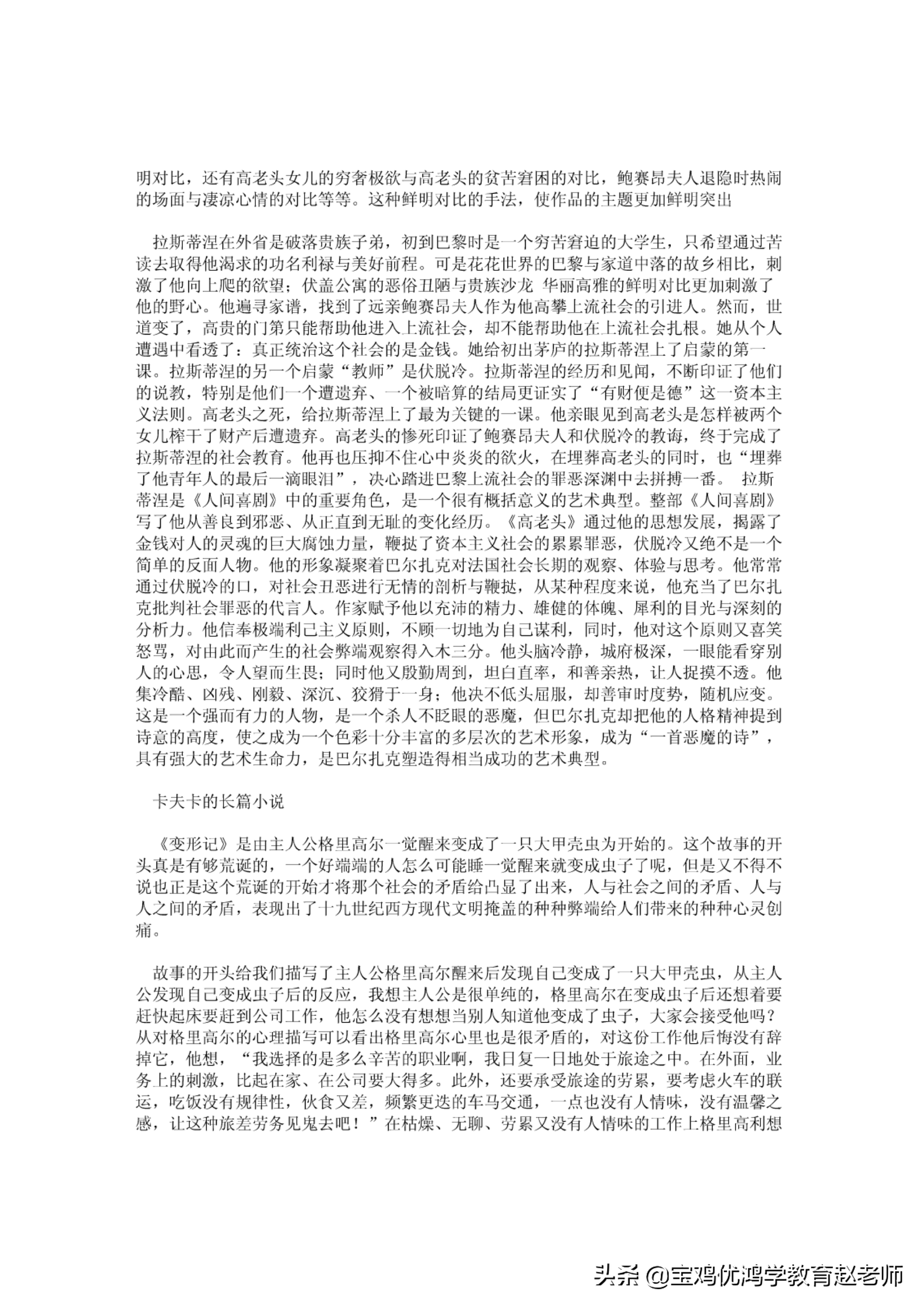 《向老头》集I11表现了巴尔扎克现实主义创作艺术的主要特色.1)精细|而富有特征的典型环境.巴尔扎克非泊重视详细而逼真的环境描绘,一方而是为了再现生活,更重要的是为了刻画人物性格.2)人物性格的典型化口巳jJ扎克不仅塑造了市里奥、拉斯蒂涅、鲍赛昂夫人、{}飞脱冷等典型形象,而门.在其他人物形象的理it叫1也做到f共性与个性的统一.3)精敛的结构.小说以肖老头和l拉斯蒂沮的故事为两条宅要线索,义穿插了伏脱冷、鲍赛ep夫人的故事.儿条线索错综交织,头绪轩似纷繁而实际主次分明、脉络清楚、有条不紊.对比手法的广泛运川JO艺术上的对比手法在《高老头》中运用何十分广泛.伏盖公寓与鲍赛昂府的强烈对比F高贵庄重的鲍赛昂夫人与粗俗强悍的伏脱冷形成鲜明对比,还有高老头女儿的穷奢极欲与高老头的贫肯岩困的对比,鲍赛昂夫人堪隐时热闹的场面与凄凉心情的对比等等.这种鲜明对比的手法,伎作品的主题更加鲜明突fl\拉斯蒂沮在外省是破落贵族子弟,初到山黎H才是一个穷背窘迫的大学生,共希望通过背读去取得他渴求的功名利禄与美好前程.可是花花世界的口黎与家道r1I烙的故乡相比,刺激了他向上爬的欲望:伏盖公寓的恶俗丑陋与贵族沙龙华丽高雅的鲜明对比更加|剌激了他的野心.他遍寻家谱,找到了远亲鲍赛ti夫人作为他向攀上流社会的引进入.然而,世道变了,高贵的门第只能帮助他进入t流社会,却不能帮助他在t流社会扎根.她从个人遭遇I11看透f:真正统泊这个社会的是金钱.她给初出茅庐的拉斯蒂涅上f启蒙的第一课.拉斯蒂湿的另一个启蒙"教师"是伏脱冷.拉斯蒂涅的经历和见闻,不断印证了他们的说教9特别足他们一个遭迫弃、一个被暗算的结局更证实了"有财便足德"这一资本主义法则.高老头之死F给拉斯蒂涅止了最为A键的一课.他亲眼见到高老头是怎样被两个女儿榨干了财产后遭遗弃.高老头的惨死印证了鲍赛日夫人和伏脱冷的教诲,终于完成了拉斯蒂涅的祉会教育.他再也压抑不住心中炎炎的欲火,在埋葬高老头的同时,也"埋葬了他青年人的最后一滴眼泪,,'决心踏进巴黎上流社会的罪恶深渊中去拼搏一番.拉斯蒂涅是《人问喜剧》中的重要角色川是一个很有概括意义的艺术典型.整部《人问喜剧》写了他从善良到邪恶、从正直到无耻的变化经历.《高老头》通过他的恩想发展,揭露了金钱对人的灵魂的』大腐蚀力量,鞭挝了资本主义社会的累累罪恶,伏脱冷义绝不是个简单的反面人物.他的形象凝聚着巴尔扎克对法|玉|社会长期的观察、体验与思考.他常常通过伏脱冷的U,对社会妇恶进行无惰的剖析与鞭姑,从某种程度来说,他充当了巴尔扎克批判社会罪恶的代言人.作家赋予他以充沛的精力、雄健的体魄、犀利的日光与深刻的分析力.他信奉极端利己主义原则,不顾一切地为臼己谋利,同时,他对这个原则又喜笑怒骂,xf向此rn1产生的祉会弊端观察得入木二,分.他头脑冷静,城府极深,u良能看穿别人的心思,令人望而生良:同时他又殷勤周到,坦白直率,和善亲热,让人捉摸不透.他集冷酷、凶残、刚毅、深沉、狡猾于一身;他决不低头屈服,去IJ善审时度势,随机j业变.