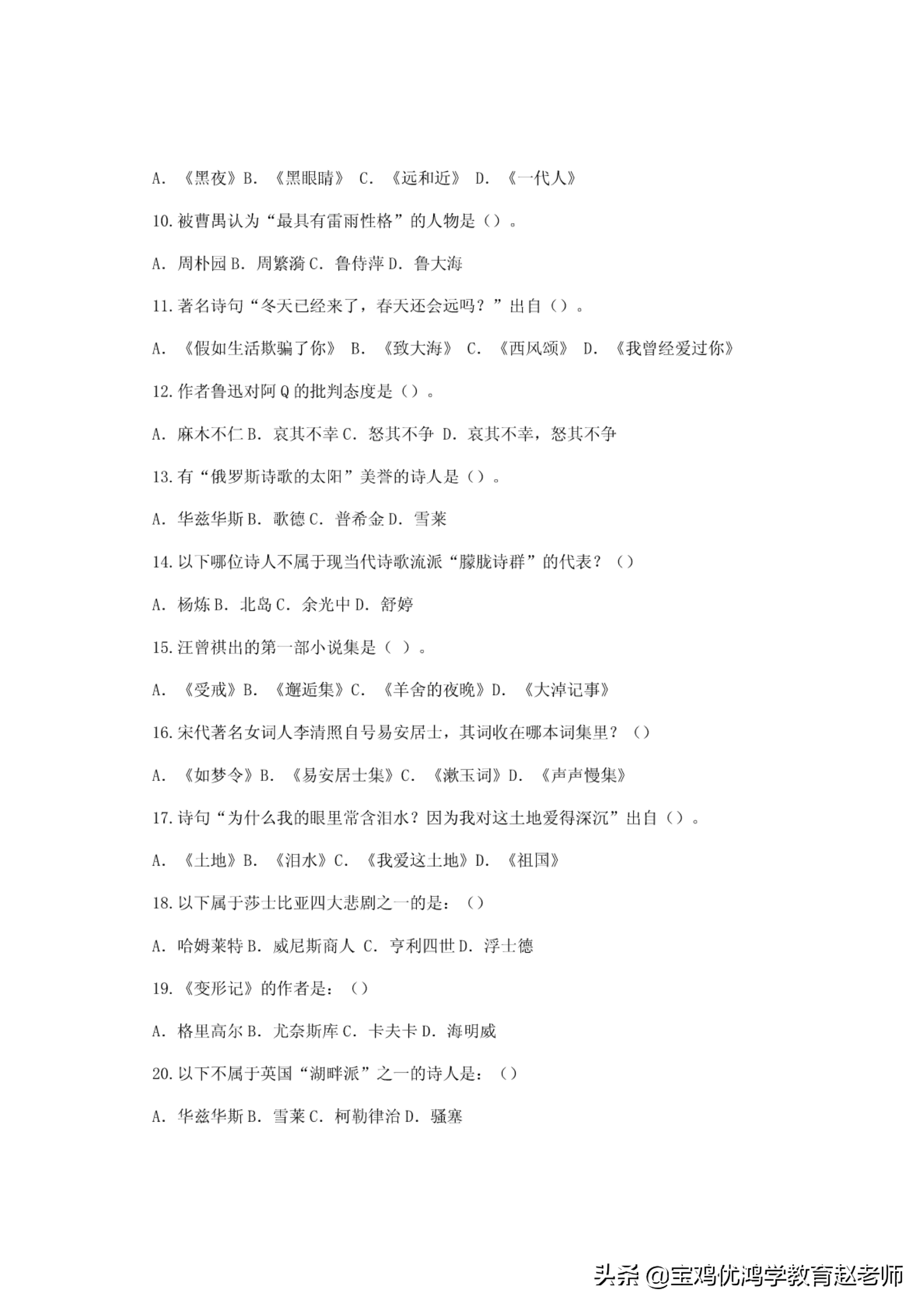 A.格且高}JB.尤奈Wr库C.卡夫卡D.海明威20.以下不属于英国"湖畔派"之一的诗人是:.