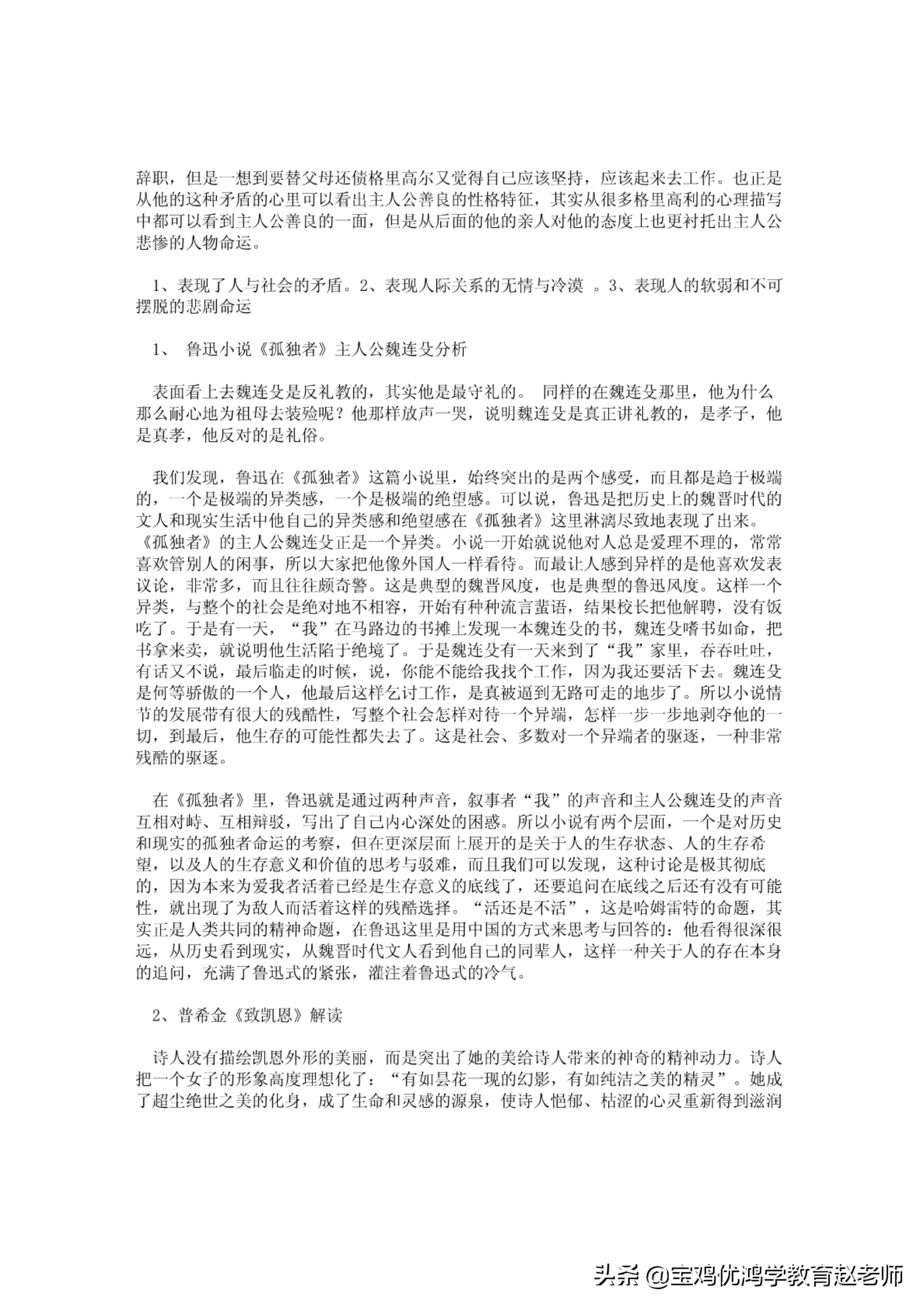 1、表现了人与社会的矛盾.2、表现人际关系的无情与冷漠.3、表现人的软弱和不可摆脱的悲刷命运1、鲁迅小说《孤独者》二i二人公魏连支分析