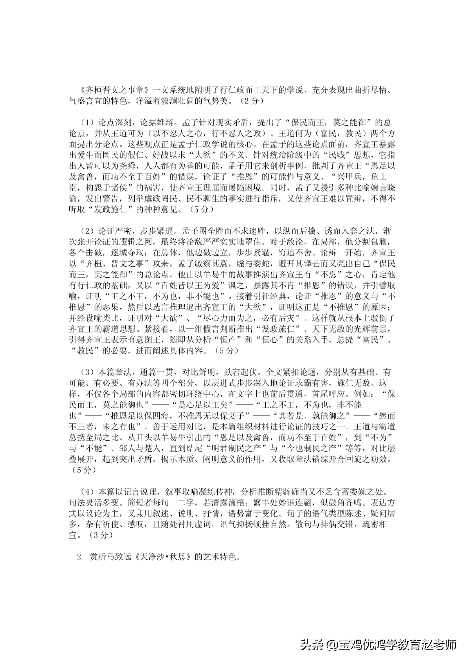 《齐iff!晋文之事章》一文系统地阐明了行仁政而王天F的学说,充分表现出曲折尽情、气盛言宜的特色,洋溢着波澜壮阔的气势矢.(2分〉(1)论点深刻,论据雄辩.孟子针对现实矛盾,提出了"保民而王,失之能御"的总论点,并从王道可为〈以不忍人之心,行不忍人之政〉、干.道何人}(富民,教民〉两个万面提山分论点.这些观点正足孟子仁政学说的核心.在孟子的这些论点面前,齐宣王暴露出爱牛而|剖民的假仁、!Jf战以求"大欲"的不义.针对统治阶级中的"民贱"思想,它指出人皆可以为尧舜,人人都有为苦的可能,孟子用它米剖析*例,批判了齐宣王"思足以及禽兽,而功不至于百姓"的错误,论证f"推恩"的可能性与意义、"兴甲兵,危土臣,构怨于诸侯"的祸害,使齐宣二E蚓剧而屡|也困境.同时,孟子义援引多种比喻婉言晓谕,发出警告,列举虐政罔民、民不聊生的事实进行指斥,又使齐立王难以置辩s不得不听取"发政施仁"的种种意见.(5分〉(2)论证严密,步步紧涵.孟子阁全胜而不求i辜胜,以纵而后擒、诱而入套之法,渐次张开论证的逻辑之|咐,最终将论敌严严实实地罩住.对于敌论,在局部,他分割包剿,各个击破,逐城夺取;在总体,他边破i1l立,步步紧逗,穷远不舍.论辩一开始,齐主五以"齐桓、普文之事"攻来,孟子敏察其意,虚与委蛇,避开其锋芒而又先山自己"保民而王,莫之能御"的总论点.他由以羊劫牛的故事推演出齐Ti.王有"不忍"之心,肯定他有行俨政的基础F又以"百姓皆以王为爱"讽之,暴露其不肯"推忠"的错误,并iJI譬驭喻,证印j"王之不王,不为也,非不能也".接着引征经典,论证"打t恩"的意义与"不推恩"的恶果,然后以边言推理逼出齐R王的"大欲",证明这正是"不推恩"的原因:并经设!喻类比,证明对"大欲"、"尽心力而为之,必有后灾’1这样就从根木上驳倒了齐立王的霸道思想.紧接着,以一组假言判断推出"发政施仁.''、天下无敌的光辉前去,引得齐宜王表示有意罔王p随即从分析"恒j心:刀不IJ"恒心'的关系入手,总提"富民,,、"教民"的必要,进而阐述具体内容.(5分〉(3)本篇章法,通篇一贯,对比鲜明,跌岩起伏.全文紧扣1论题,分别从有基础、有可能、有必要、有办法等问个部分,以层:i1t式步步深入地论证求霸有存,施仁无敌.这样,不仅各个局部的内容都密切环绕中心,在文字上也前后贯通,首尾呼应.例如:"保民而王,芙之能御也'一一"是心足以王矣"一一"王之不王,不为也,非不能也"一一"推恩足以保阿海,个推恩元以保妻子"一一"其若是,孰能御之"一一"然而不王右,术之有也’\善于运用对比,是本篇组织材料进行论证的技巧之一.王道与霸道总携全局之比.从)|二头以羊易牛引出的"恩、足以及禽兽,而功不至于百姓",到"不为"与"不能''、邹人与楚人,直到结尾"明君制民之产"与"今也制民之产"等等F对比层叠展开,起到突山矛盾、揭示本质、阐明意义的作用,又收取举法钻综开合同旋之功效.(5分)(4)本篇以记言说理,叙事取喻凝练传神,分析推断精辟确当义不乏蓄委婉之处.句法灵活多变.简短右句句一二字,轩消摇滴才舌;繁中处妙语连刷,{以鼓角齐鸣.表达方式以议论为主,又兼用叙述、说明、抒情,语势’自于变化.句手的语气类型陈述、疑问居多,杂有祈使、感叹,且随处村用虚词,话气抑扬顿挫臼然.散句与排偶交钳,疏辛苦相宜.(3分〉2.赏析马致远《天J争沙·秋思》的艺术特色.