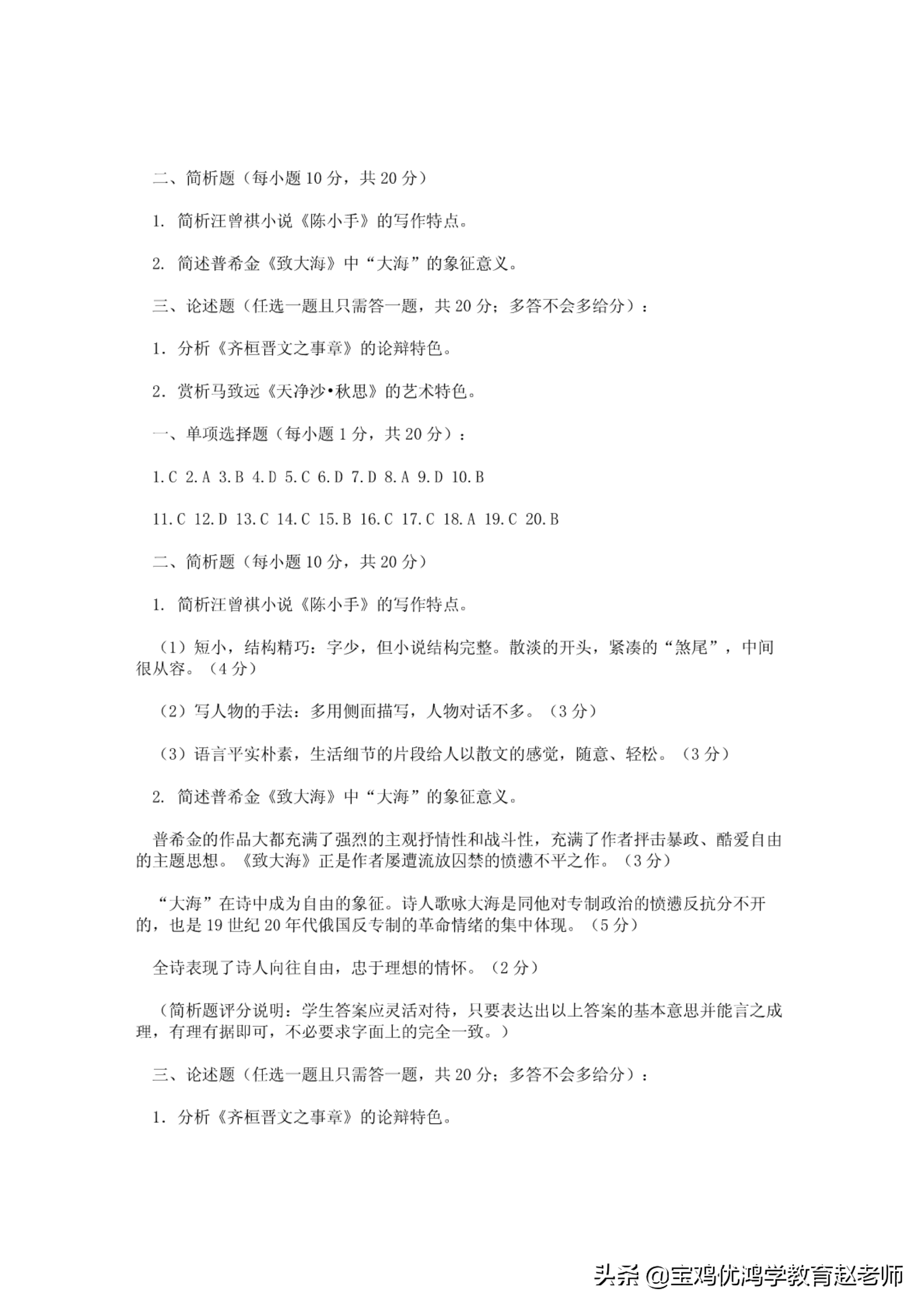 2.1Ji析马致远《夭净沙·秋思、》的艺术特色.一、单项边择是豆〈每小题1分,共20分〉:1.