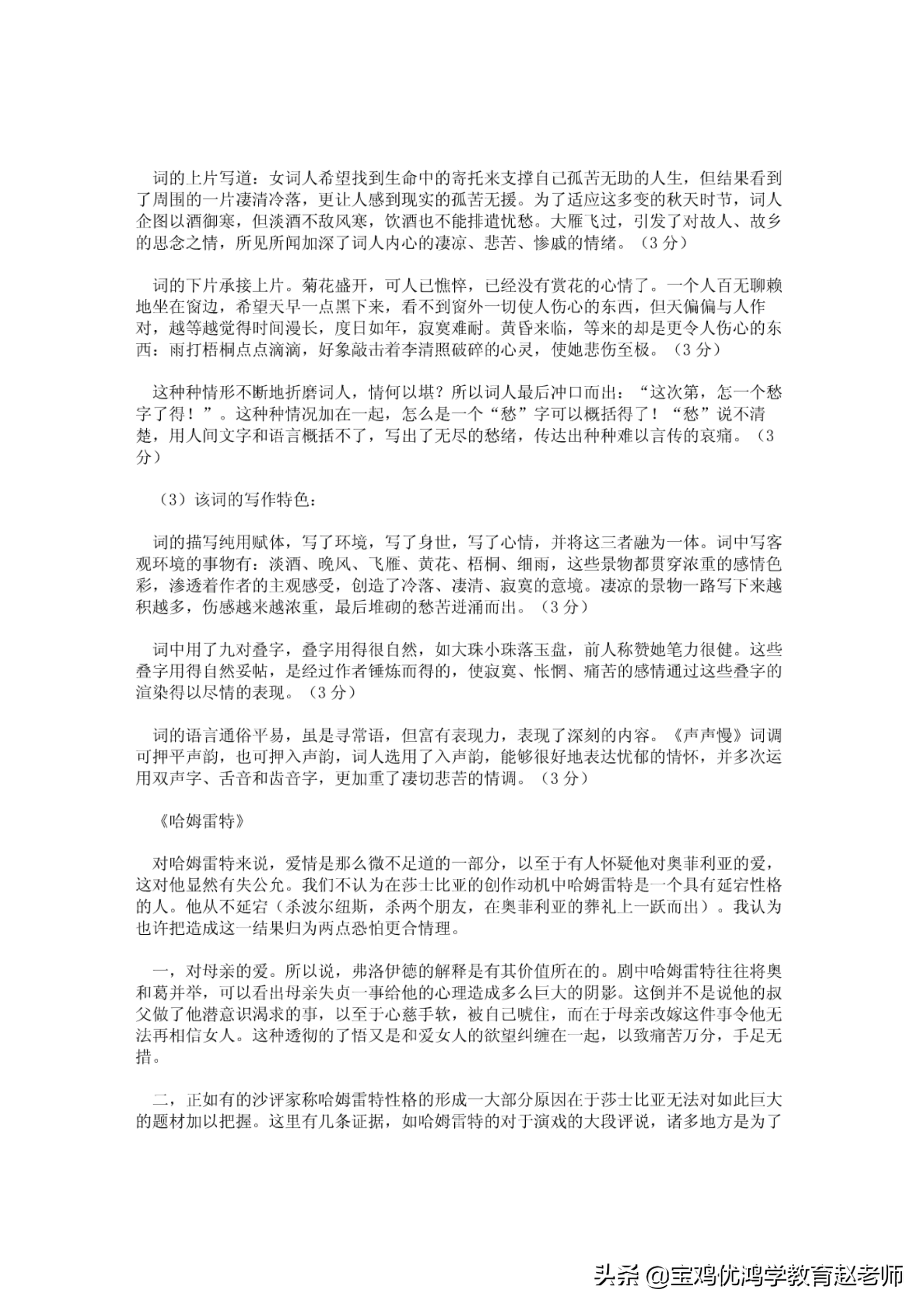词的描写纯用赋休,写了环境,写了身世,写了心情,并将这三者融为一休.词中写客观环境的事物有:淡酒、晚风、飞雁、黄花、梧桐、细雨,这些景物都贯穿浓屯的感情色彩,渗透着作者的主观感受,创造了冷浴、波消、寂寞的意挠.凄凉的景物一路写下米越积越多,伤感越来越浓重,最后堆砌的愁怦迸涌向出.(3分〉词中用了丸对叠字,叠字周得很们然,女|!大珠小珠落玉棋,前人称赞她笔力很健.这些需字川j得向然妥帖,是经过作者锤炼、而衔的,使寂寞、怅惘、痛苦的感情通过这些需字的渲染何以尽情的表现.(3分)词的语育通俗平易,虽处寻恬语,但需有表现力,表现了深刻的内容.《卢卢慢》词调可押平声韵,也可押入声韵,词人选用了入声韵,能够很好地表达忧郁的情怀,并多次运用双声字、舌音和齿音字,更加重了凄切悲苦的情洞.(3分〉《哈姆雷特》对哈姆雷特米说,爱情是那么微不足道的一部分,以王气于有人怀疑他对奥菲利亚的爱,这对他显然有失公允.我们不认为在莎士比亚的创作动机中哈姆富特是一个具有延岩性恪的人.他从不延岩〈杀波尔纽册,杀两个朋友,在奥菲利亚的葬礼上一跃而出〉.我认为也许把造成这一结果归为网点恐怕更合情理.