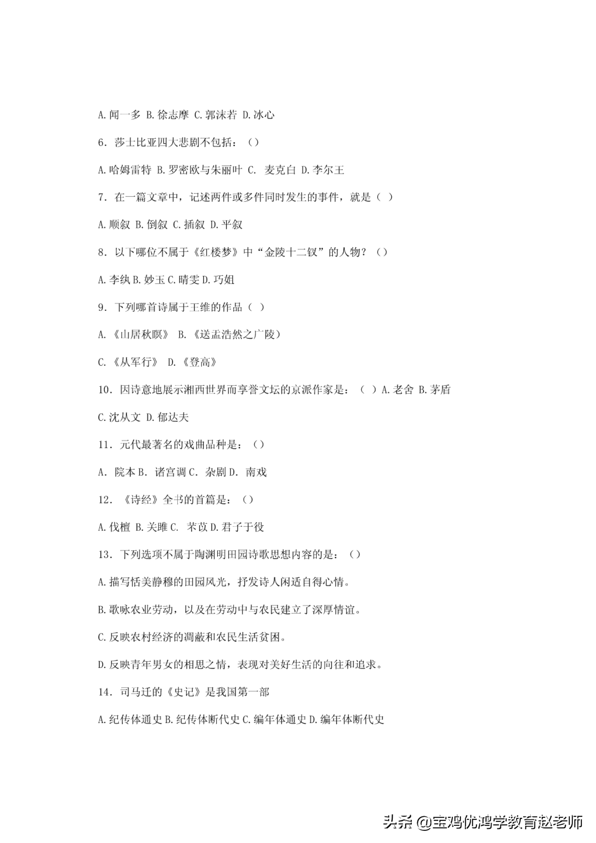 A.纪传体迦史B.纪传体断代虫C.编年体通史D.编牛体断代史15.干列ilt项巾属于李清照词作的是:.
