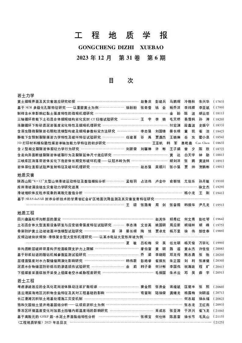 《工程地质学报》由中国科学院主管,中国科学院地质与地球物理研究所主办,依托于中国科学院页岩气与地质工程重点实验室和中国地质学会工程地质专业委员会,是我国工程地质学科综合性的高级学术期刊。中国工程院院士,国际工程地质与环境协会前主席王思敬研究员任本刊主编。《工程地质学报》被中文核心期刊,中国科技核心期刊,CSCD等数据库收录。1993年创刊,现为双月刊。