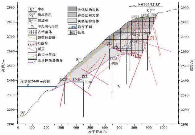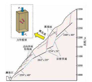 本文以某水电站大变形岸坡为例,在深入研究岸坡所处的地质背景基础上,调查了岸坡大变形破坏模式,包括“下沉-楔入”破坏、塌滑破坏、倾倒拉裂变形、深部岩体“张裂”。基于物理模拟试验揭示了边坡变形破坏模式受控于多组结构面控制,即表现为花岗岩板裂岩体沿陡倾坡内组结构面倾倒、沿陡倾坡外组结构面拉张、下沉,倾倒导致块状岩体根部折断,折断面追踪坡体内中缓倾角结构面且伴有剪切蠕滑;随变形的加剧,倾倒折断追踪坡体已有陡缓结构面而逐渐形成宏观的连续破裂面,岩体深部变形边界具有典型的阶梯状形态。在岸坡变形破坏模式的地质分析及物理模拟基础上,对岸坡大变形成因进行了分析,并阐明了岩质大变形岸坡形成演化机制。研究表明现今岸坡大变形机制为上部楔入-倾倒产生的推挤性变形与下部鼓张、倾倒性牵引变形的复合变形机制,地质力学模式概括为:块状倾倒-滑移复合型变形破坏模式。