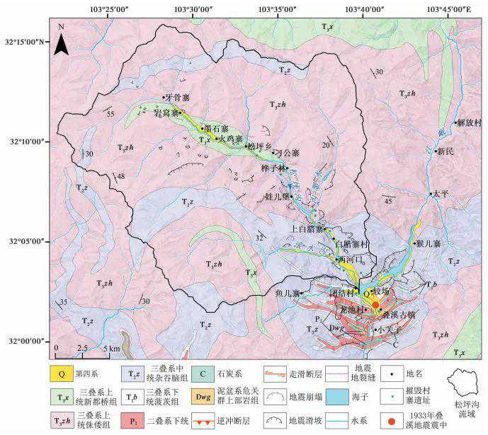 1933年8月25日四川叠溪发生MS7.5地震,一种代表性的观点认为松坪沟断层为此次地震的发震构造。而对于松坪沟断层的存在、发育分布以及其活动性,学者们至今仍存在一定的分歧。本文基于前人研究成果,对松坪沟中下游(松坪沟沟口至墨石寨)进行了详细的野外地质调查,并结合地球物理探测,证实了松坪沟断层的存在;松坪沟断层整体走向NW,沿松坪沟呈三段斜列式展布(NW段、中间段和SE段),其NW段倾向NE,中间段和SE段倾向SW,倾角约55°~80°;松坪沟断层以左旋走滑运动为主、兼逆冲性质,在距今两万年以来有过活动。最后通过对松坪沟流域地貌参数分析表明,该区地貌发育上处于幼年期晚期和壮年期,构造活动强烈,且松坪沟断层中间段和SE段的活动性较NW段强烈。