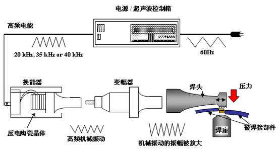 超声波作用于热塑性的塑料接触面时,会产生每秒几万次的高频振动,这种达到一定振幅的高频振动,通过上焊件把超声能量传送到焊区,由于焊区即两个焊接的交界面处声阻大,因此会产生局部高温。又由于塑料导热性差,一时还不能及时散发,聚集在焊区,致使两个塑料的接触面迅速熔化,加上一定压力后,使其融合成一体。当超声波停止作用后,让压力持续几秒钟,使其凝固成型,这样就形成一个坚固的分子链,达到焊接的目的,焊接强度能接近于原材料强度。超声波塑料焊接的好坏取决于换能器焊头的振幅,所加压力及焊接时间等三个因素,焊接时间和焊头压力是可以调节的,振幅由换能器和变幅杆决定。这三个量相互作用有个适宜值,能量超过适宜值时,塑料的熔解量就大,焊接物易变形;若能量小,则不易焊牢,所加的压力也不能太大。