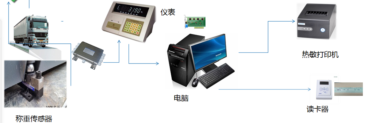 被称重物放置台面上,在重力作用下,通过承载器将重力传递至称重传感器,使称重传感器弹性体产生变形,贴附于弹性体上的应变计桥路失去平衡,输出与重量数值成正比例的电信号,经线性放大器将信号放大。再经A/D转换为数字信号,由称重仪表(磅表)的微处理机对重量信号进行处理后即可显示重量数据。称重仪表具有打印功能即可打印称重数据。如果配置计算机和刷卡器,可将数据输入计算机软件管理系统,只有具备有和软件配对的智能卡片刷卡后通过打印机就可以打印出称重重量,既可以实现无人值守功能。
