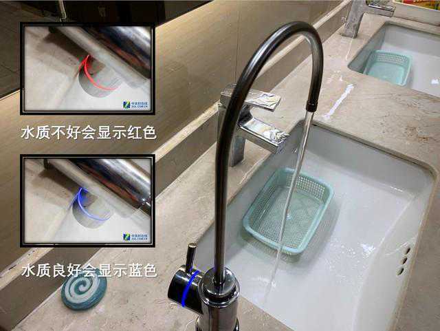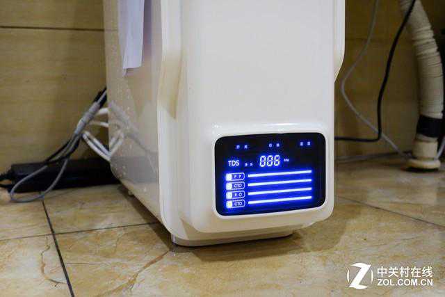 测试开始前我们对整机进行了冲洗,在这里我们又从龙头上找到了产品的特殊点,它有两种颜色。一种是红色、而另一种是蓝色,红色代表了出水水质不好,蓝色代表安全出水水质,在冲洗的过程中大概红色出现的时间不超过10秒钟,之后就再也没有出现过,冲洗过程也是比其他产品快的,这与大通量的RO膜有关。