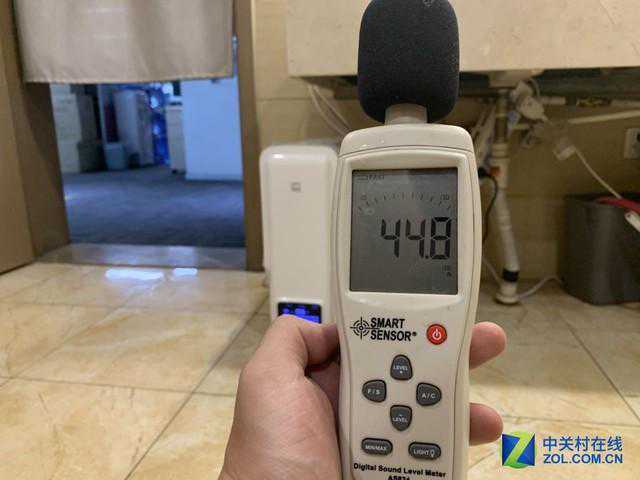 成绩44.8分贝,这比我们预想的要好,普通的无桶RO净水器的噪音普遍在50分贝左右乃至更高,在未进行厨下封闭的前提下它有这样的噪音表现实属不易。如果是厨下安装,且有柜门做噪音阻隔的话,那么在听感上,它的噪音几乎听不到的。