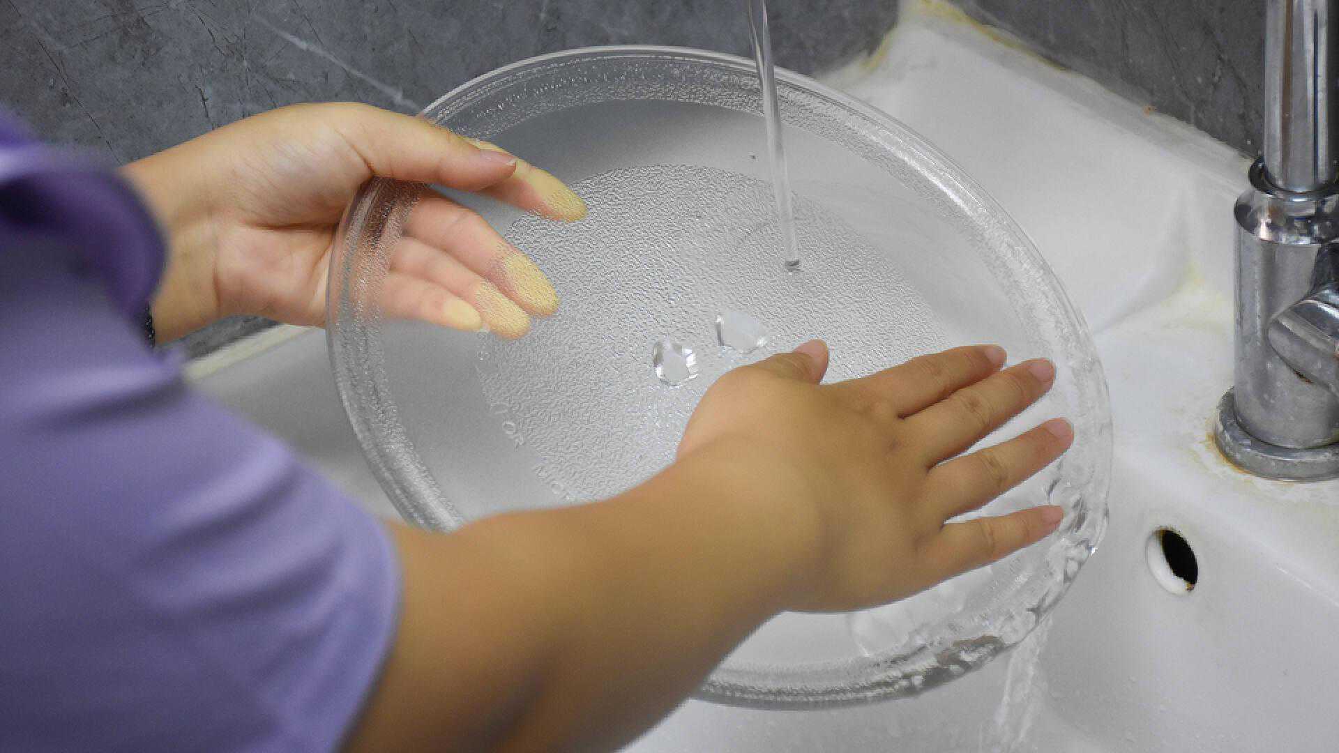 使用完以后,等到内胆温度降下来,就可以用厨房纸或者抹布擦拭内壁,纳米涂层表面很光滑,轻轻一擦就干净了。底部的玻璃盘和转动胶轴可以单独拆卸下来,可以直接用水冲洗。