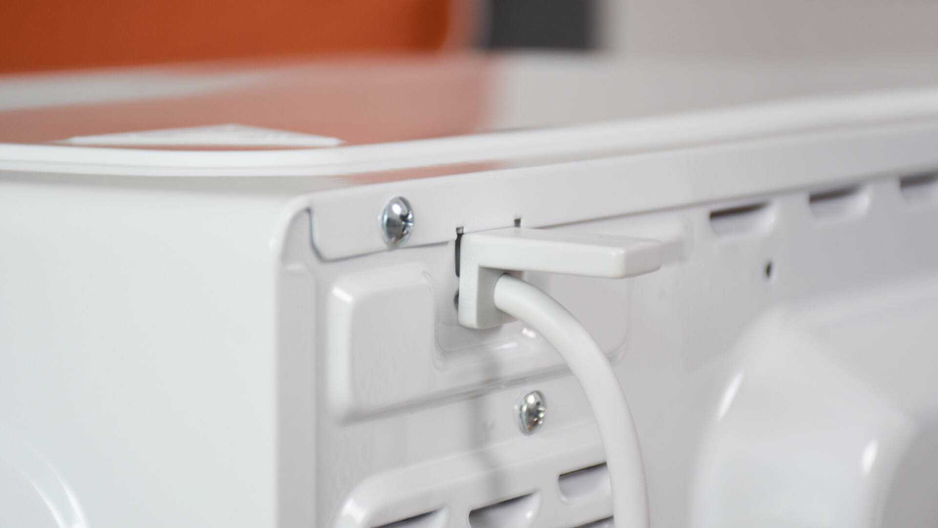 机身侧边和背部采用金属材质的外壳,背部左侧预留有散热格栅,电源线从上方延伸出来,长度大约1米左右。为了避免线材弯折,同时为背部预留出散热空间,在电源线上方设计了一个凸起的卡扣,摆放的时候可以和墙壁留出一定的缝隙。