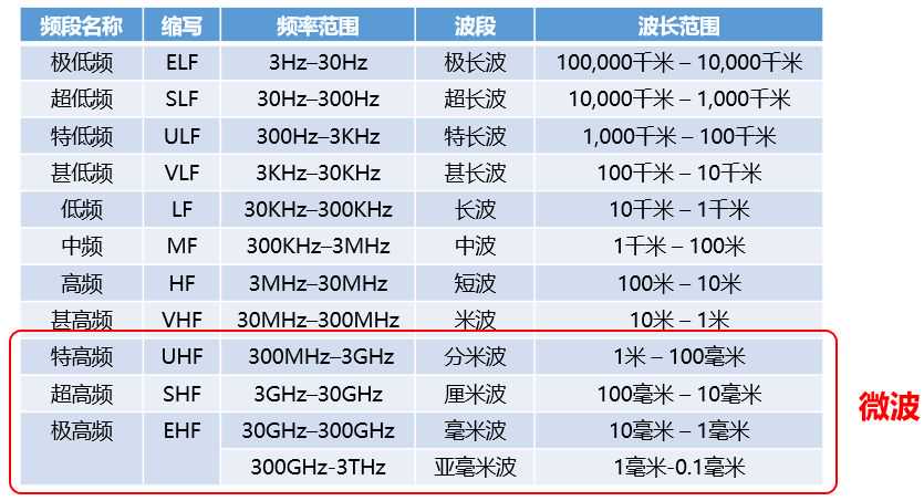 微波,是频率范围300MHz~3THz的电磁波(1THz=1000GHz),也就是说,波长范围是1米~0.1毫米(光速=波长×频率)。