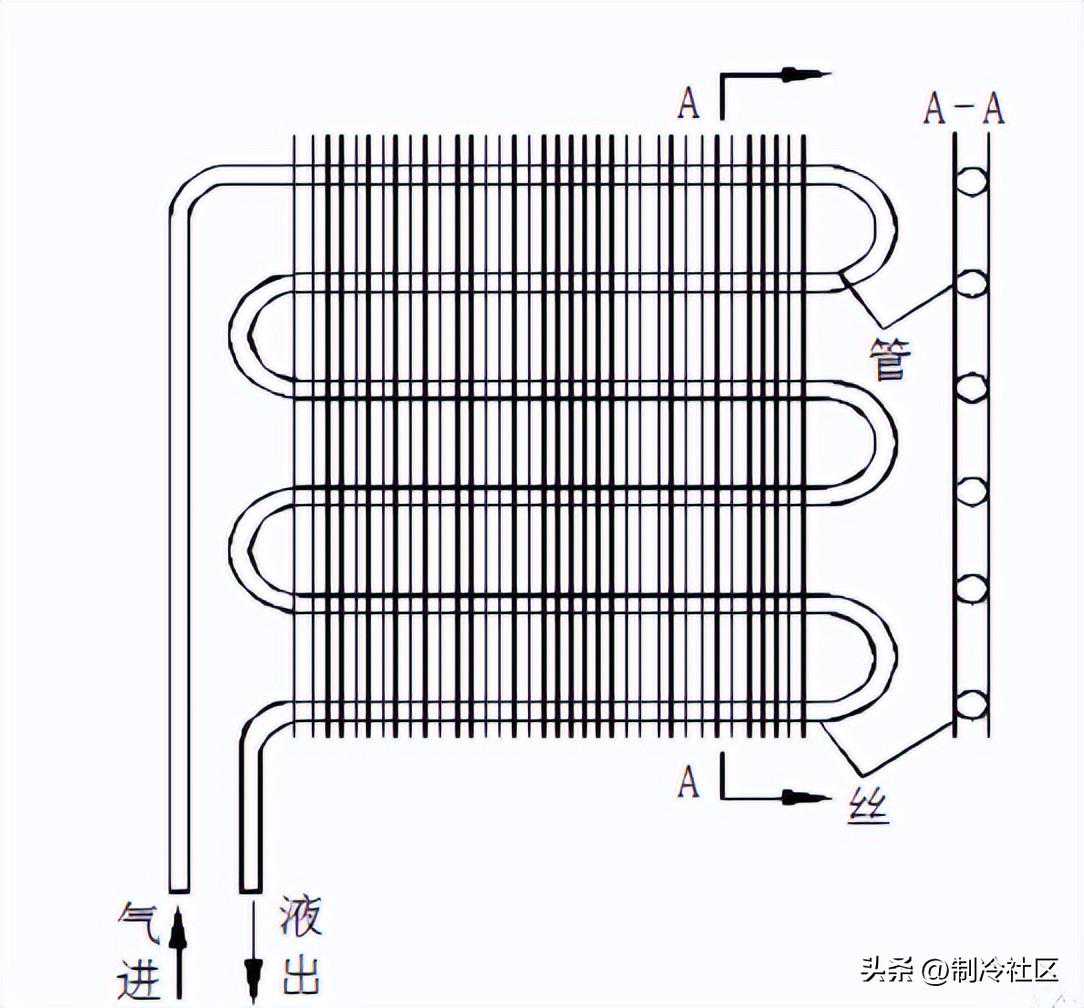 该冷凝器利用空气在管外流动时吸收制冷剂排放的热量后,密度发生变化引起空气的自由流动而不断地带走制冷剂蒸气的凝结热。它不需要风机,没有噪声,多用于小型制冷装置。如下图所示: