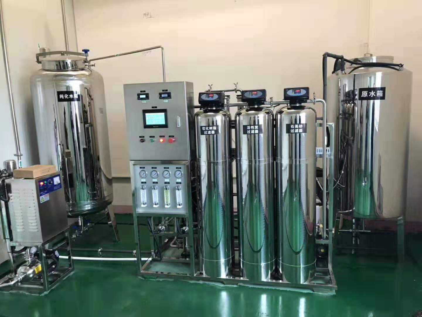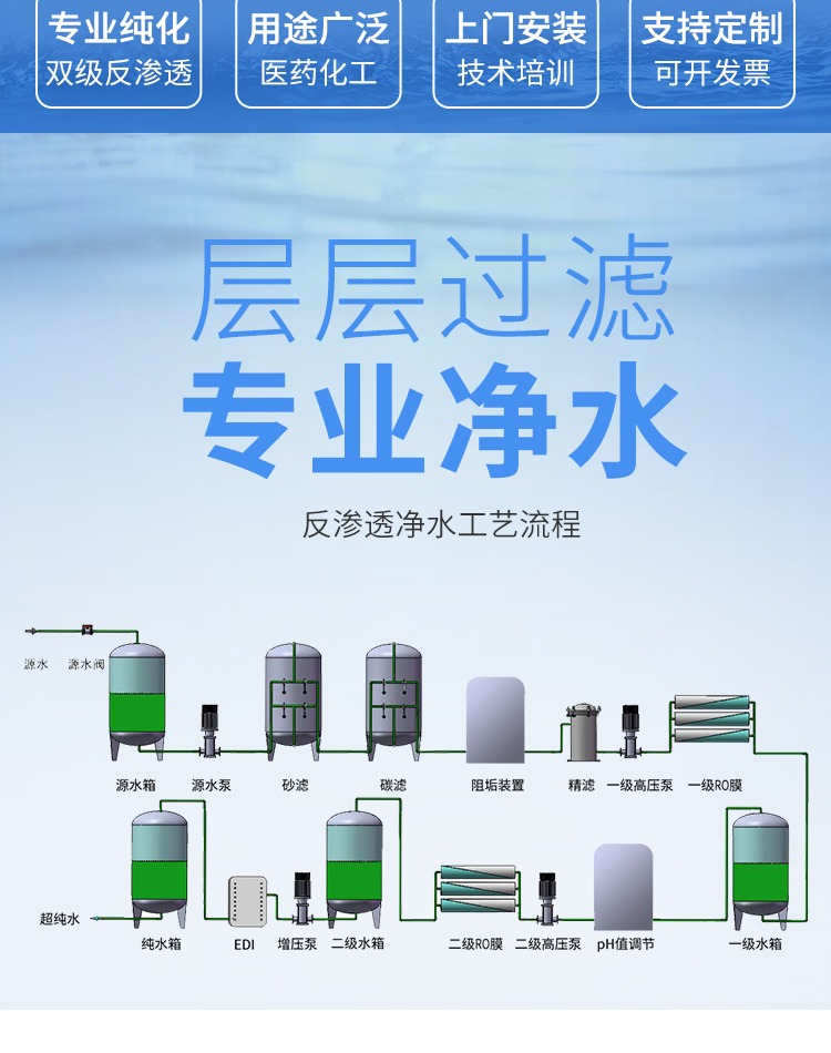 原水→原水加压泵→多介质过滤器→活性炭过滤器→软水器→精密过滤器→第一级反渗透→PH调节→中间水箱→第二级反渗透(反渗透膜表面带正电荷)→纯化水箱→纯水泵→微孔过滤器→用水点。