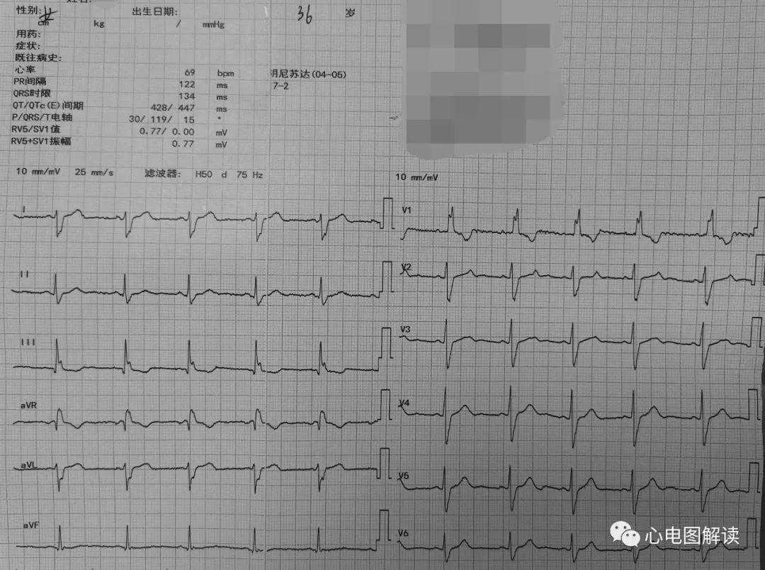 2,V1、V2、V3导联QRS呈M型,此为最具特征性的改变;Ⅰ、II、avF、V5、V6导联S波增宽而有切迹,其时限大于0.04s;aVR导联呈qr型,其R波宽而有切迹;