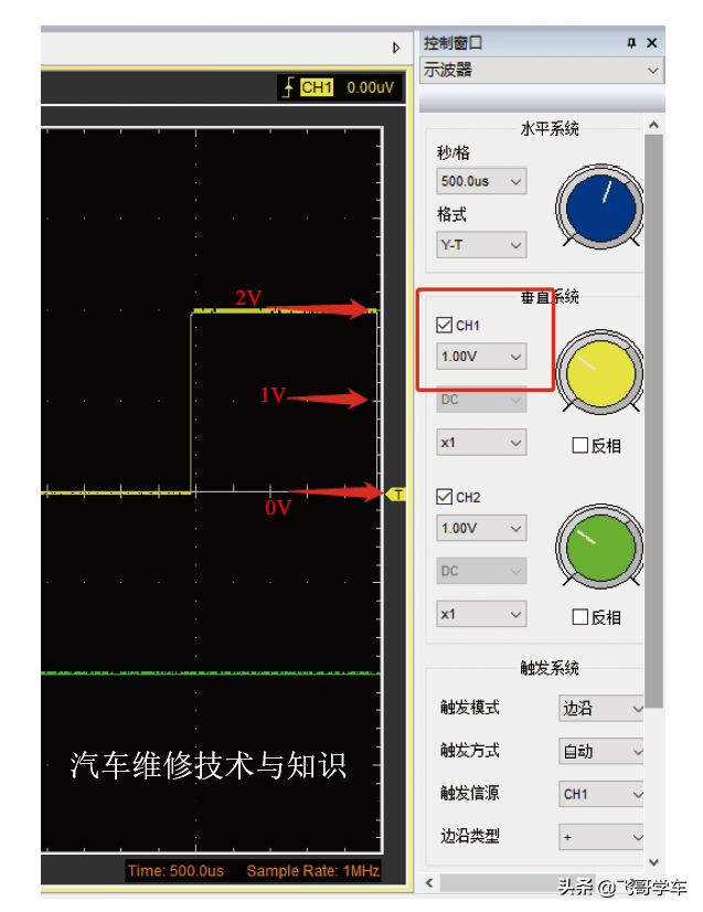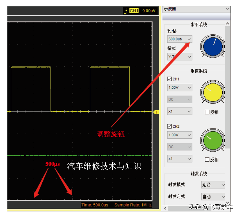 使用示波器实际上分为两个阶段:第一个阶段是要学会调整示波器,让电路中的信号变化能准确地显示在示波器上;第二个阶段是要学习各种传感器的原理,知道它是怎么工作的,以及输出的信号是什么样的,这样捕捉到的波形才有意义,才能将当前捕捉的波形和实际传感器应该输出的波形进行对比,从而找到故障。这里介绍一下如何让示波器准确地显示波形。