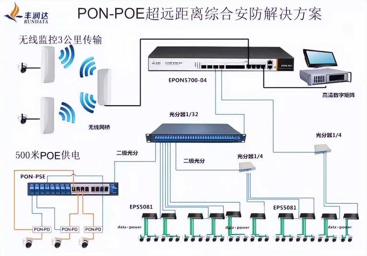 2,PON与PoE运用。整体计划方案选用PONPoE的组合方式,带PoE作用的ONU替代传统式ONU,既让PoE供电系统省掉麻烦的开关电源走线,又灵活运用PON互联网的带宽测试、远距离传输等优点,达到无线网络监管需要的超清、即时、顺畅规定。