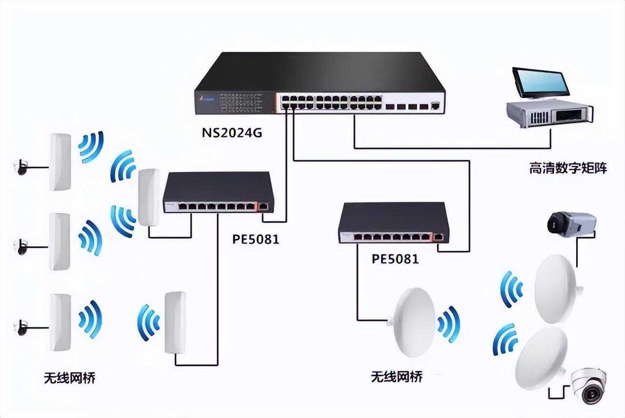 计划方案合适短路线(1~3千米)无线监控,能够点到点、点对多一点联接。无线数据传输一部分由丰润达性能卓越网桥进行,有线传送一部分选用交换机和PoE网络交换机进行,整体体系选用PoE供电系统。该计划方案基本建设低成本,高性价比,可扩充性好。