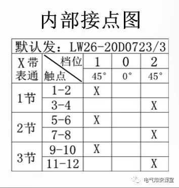 当转换开关打到"0"档,我们看"0"档这一竖的"X",然而并没有"X",所以打到这个档位,所有触点均断开。