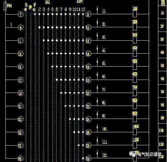 1.电容手动投切,打到不同挡位,投切电容。上面一排表示"档位",圆圈和里面的阿拉伯数字表示接线端子,如打到"5"档,有5个"实心点"投切5组电容。