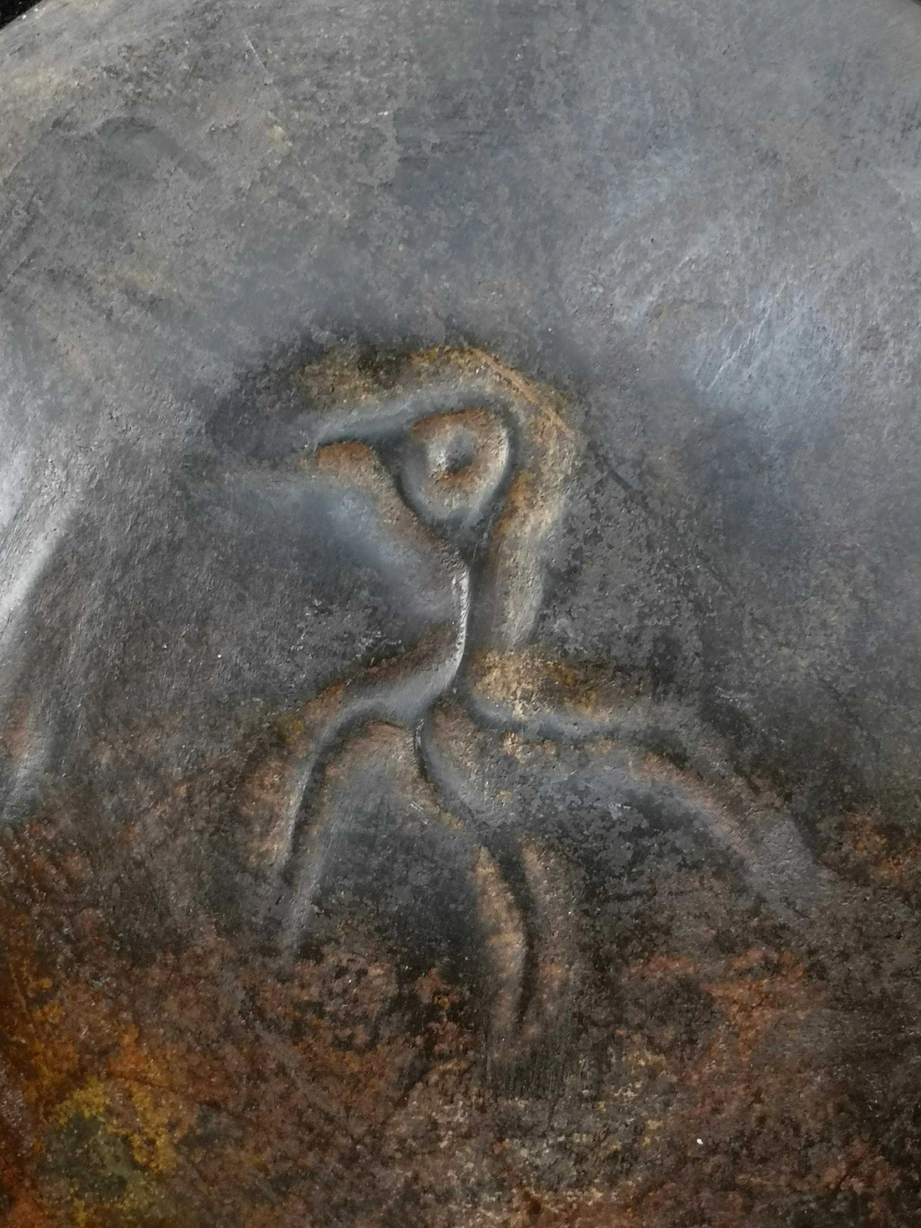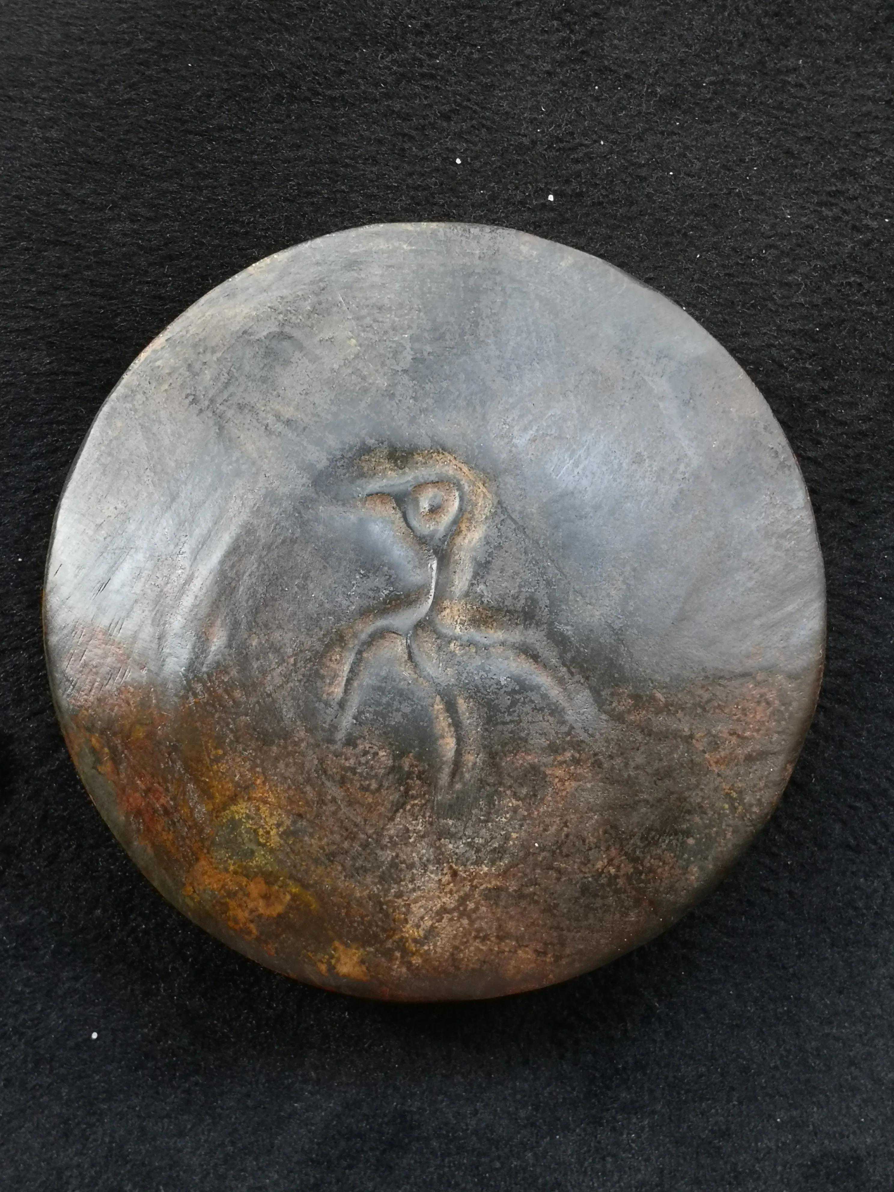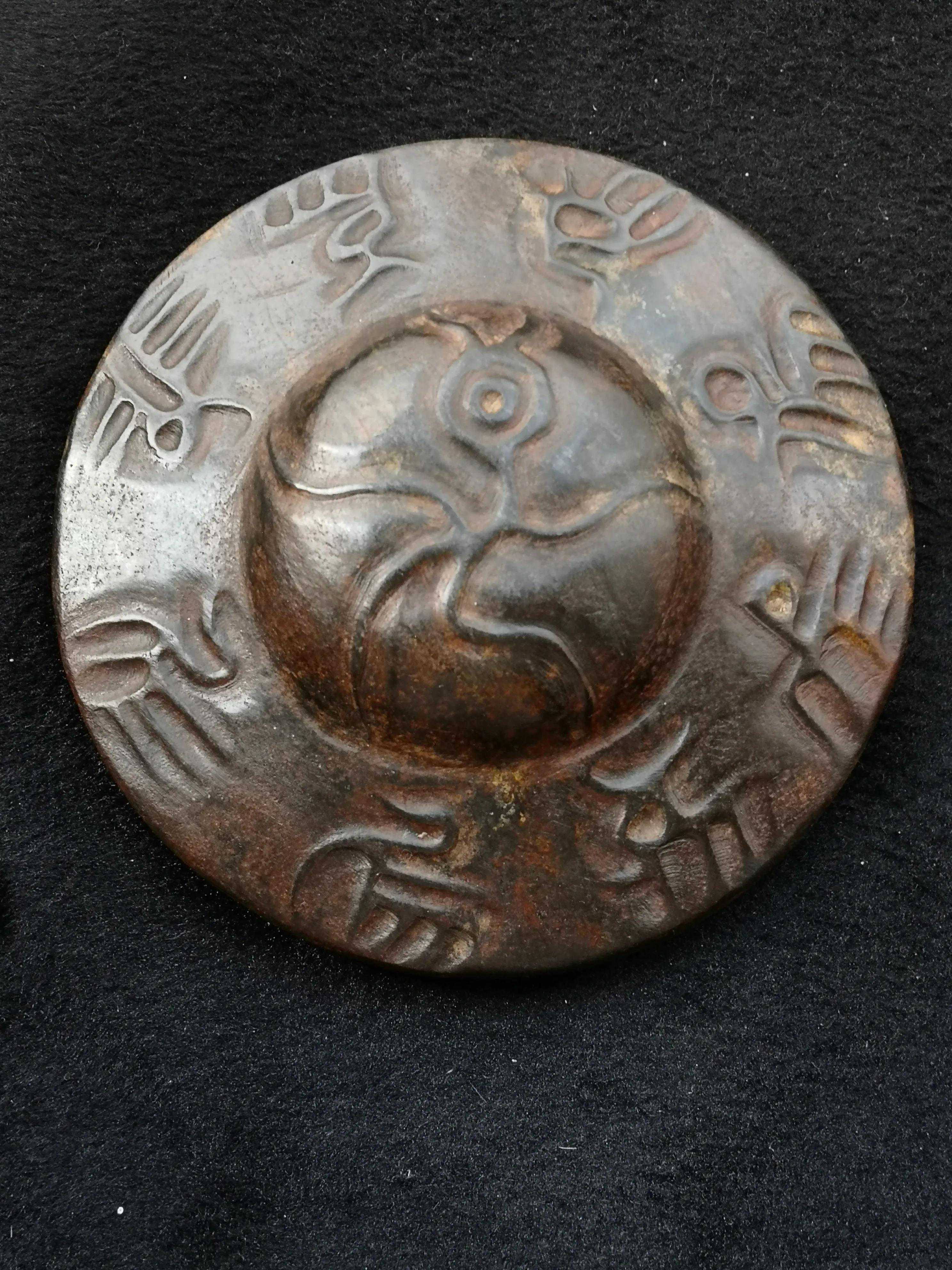 下图为(疑似)先夏时期黑皮玉飞碟碟形器,正反两面刻有(疑似)后羿射日及三足乌图案内容(收藏界关于黑皮玉的争论不在本文讨论范围),其外形酷似飞碟模型,圈内人士因为不认识其真面目故称之为“飞碟”。(这样的高古玉,认识,怀疑,惊愕乃至神思飞扬,都不足以撼动它的神秘、庄严及匪疑所思。)