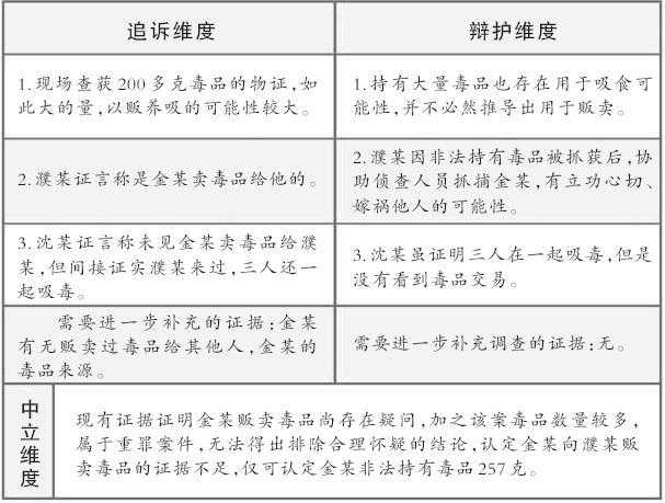 前两个维度实质上是证据整理、概括命题的过程,也是一个围绕构成要件和争议焦点进行归纳的逻辑学过程,也就是将混杂证据群解析成为简明命题的过程,将这些命题按照不同维度吸收在列表之中。第三个维度则是在前两者基础上,将不同意见并置在一起进行综合分析,得出待证事实结论的过程。