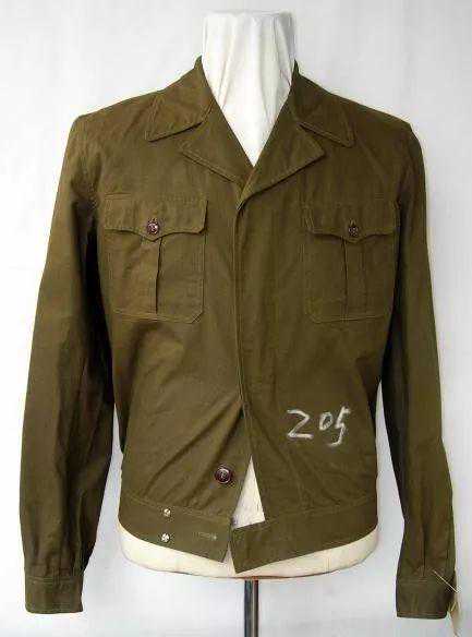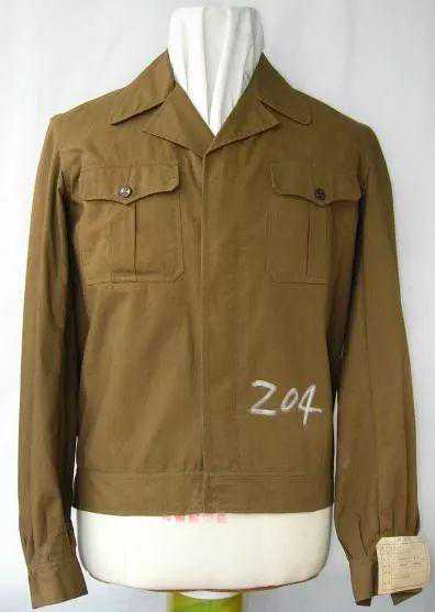 56式夏布飞行服1953年研制后装备部队。样式为上衣夹克式裤子散裤腿,上衣小翻领,有四个口袋,上贴袋、下平袋盖,袋中间缝一装饰布带,下有两个斜插袋,紧下围、紧袖口,裤子左右有两个内装插袋,用料为上衣草绿色平纹布,裤子为藏兰色平纹布。